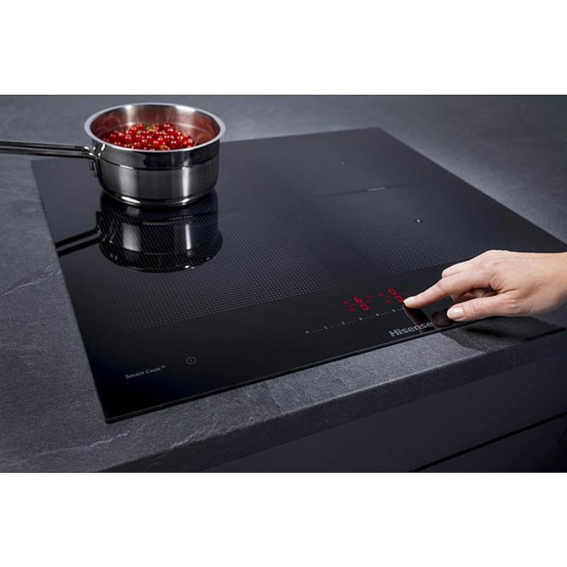 Indukční varná deska Hisense s možností propojení varných zón, funkcí časovače a automatickými programy. Ovládání výkonu pohybem prstu a dětský zámek.