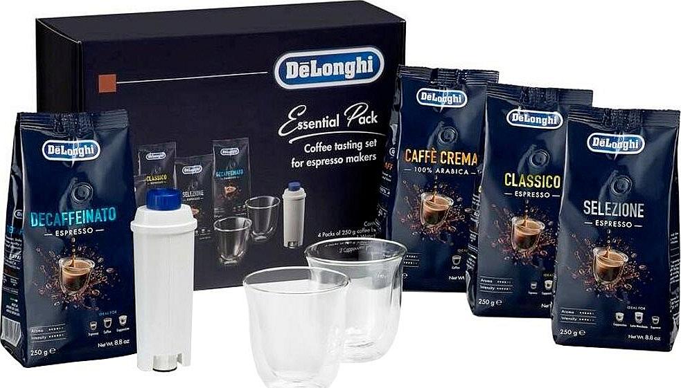 Sada kávy DeLonghi v balení se dvěma šálky na cappuccino s dvojitou stěnou a vodním filtrem.