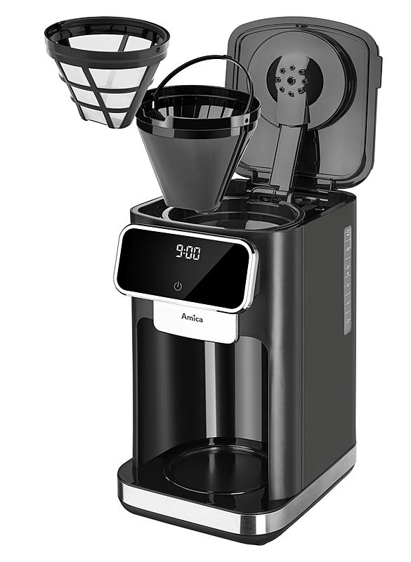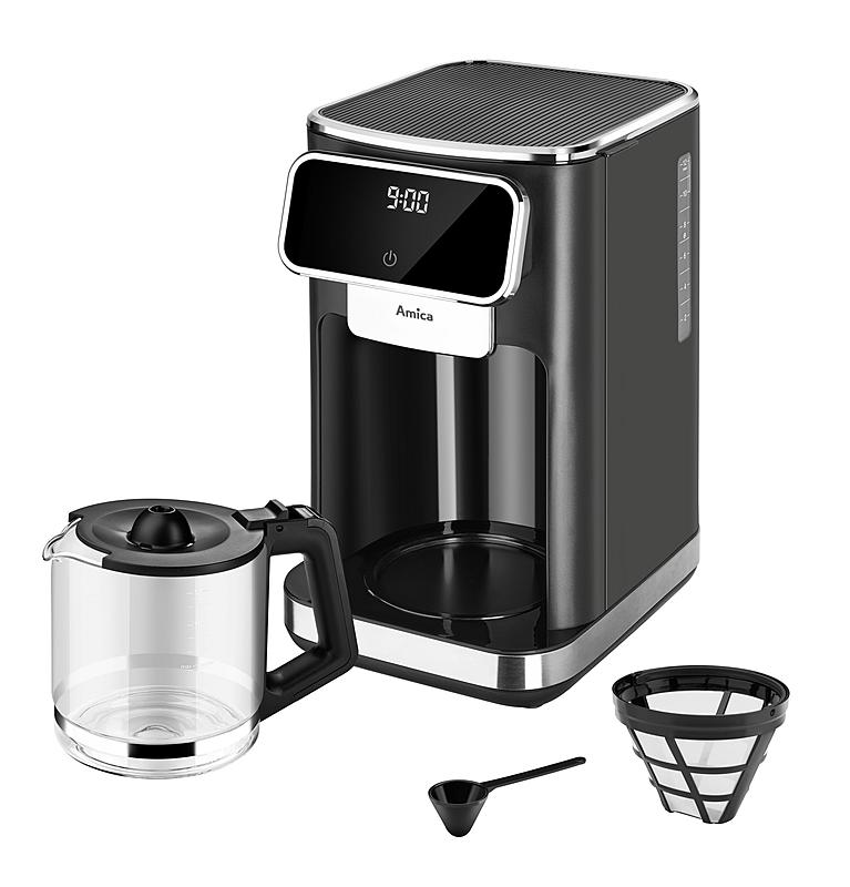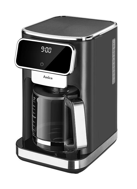 Kávovar Amica s funkcí udržování teploty a automatického vypnutí, odloženým startem a indikátorem odvápnění. Nastavení intenzity kávy a funkce ledové kávy.