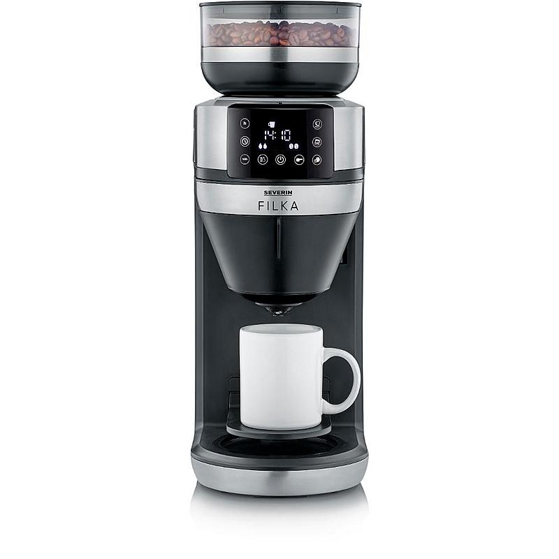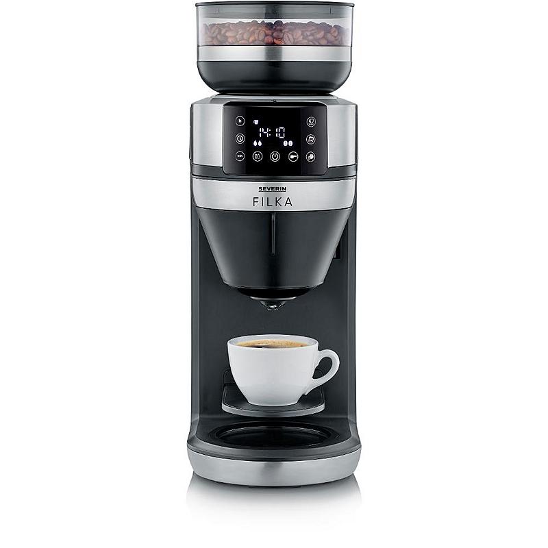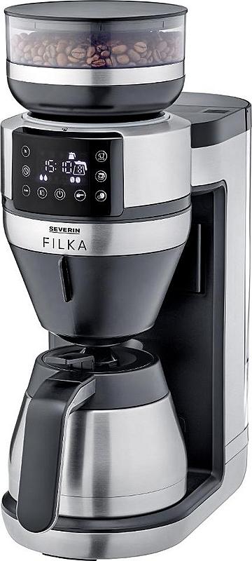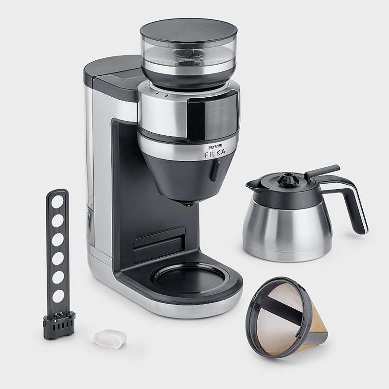Kávovar Severin s časovačem, termokonvicí s objemem 2 l a kávomlýnkem.