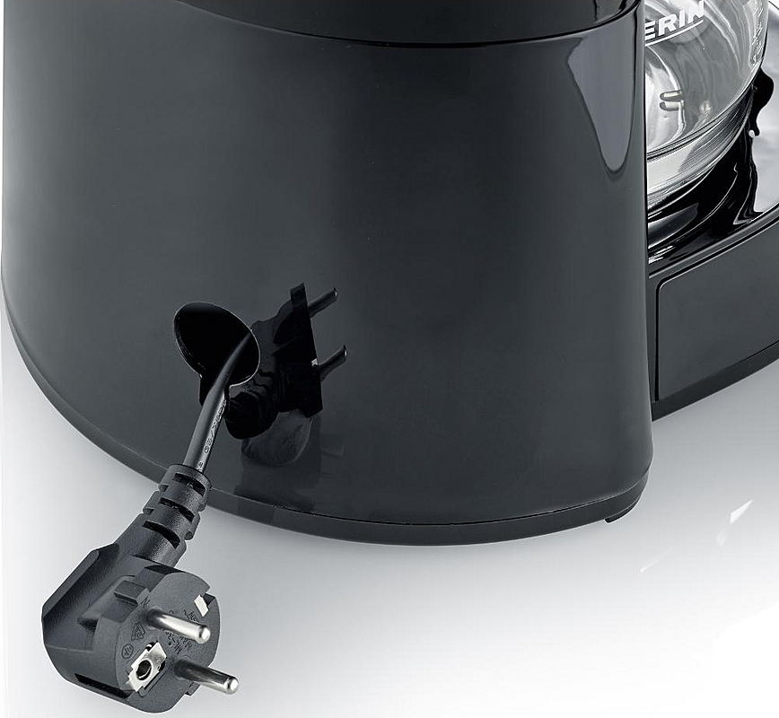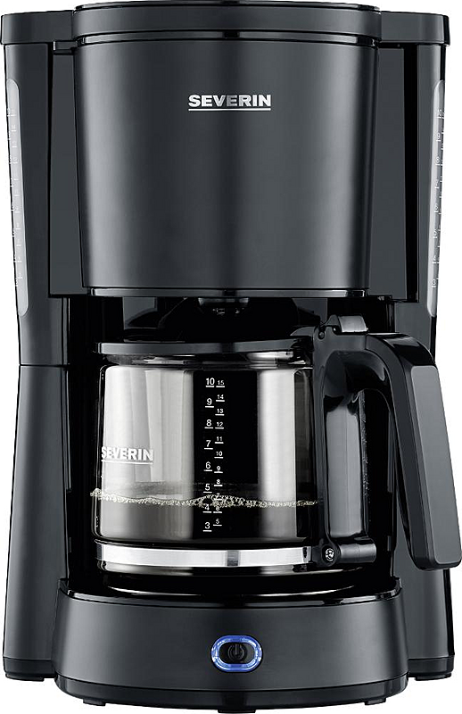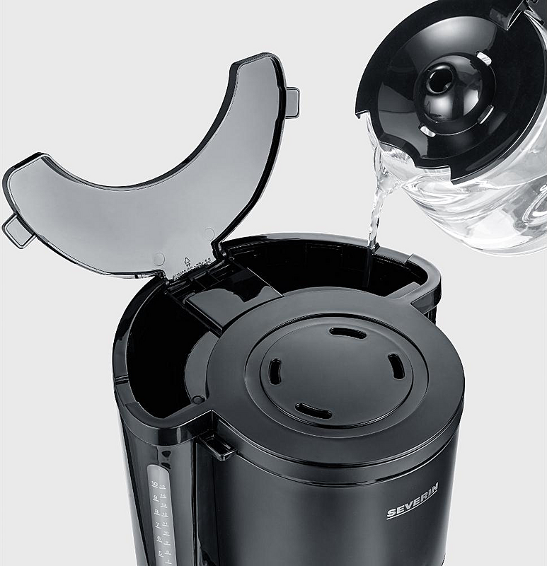 Kávovar Severin s kapacitou až 10 šálků, výklopným filtrem a automatickým vypnutím.