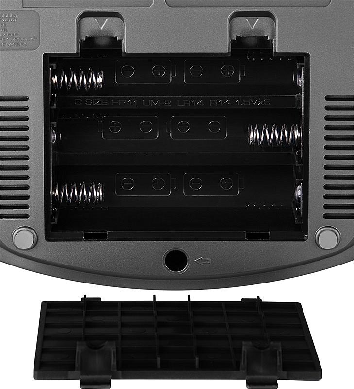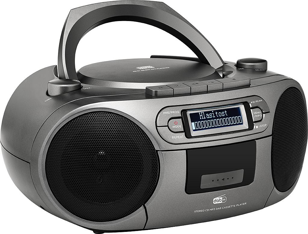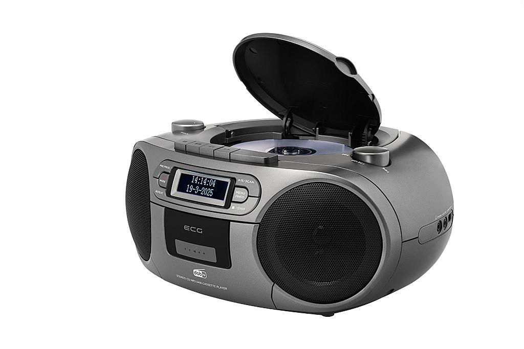 CD rádio ECG s kazetovou mechanikou, LCD displejem a výstupem na sluchátka.