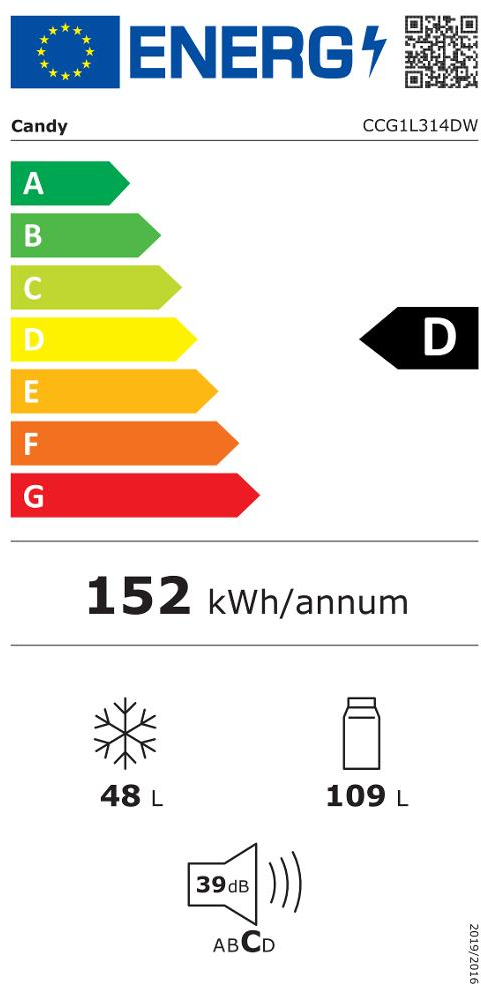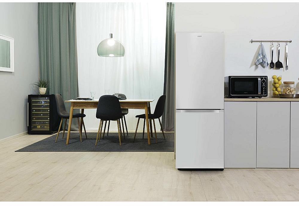 Kombinovaná chladnička Candy s automatickým odmrazováním a LED osvětlením. Energetická třída D, mrazící výkon 2,2 kilogramy za den a celkový objem 157 litrů.