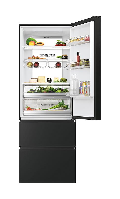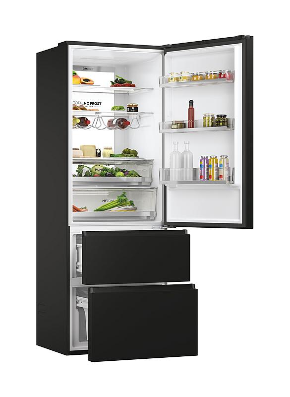 Beznámrazová kombinovaná lednice s šířkou 70 cm, invertorovým kompresorem a možností ovládání přes WiFi. Celkový objem 483 l, oddělená regulace a funkce super chlazení i mrazení.