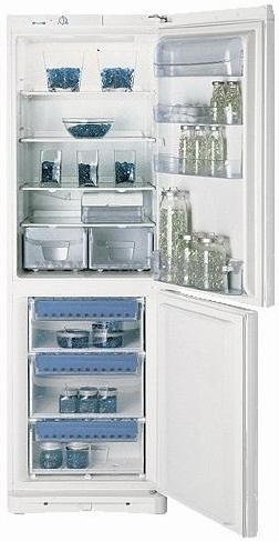 Kombinovaná chladnička Indesit se skleněnými policemi a Flex Cool Box přihrádkou. Aby se ušetřil prostor v mrazáku jsou zásobníky na led integrovány do zásuvek.