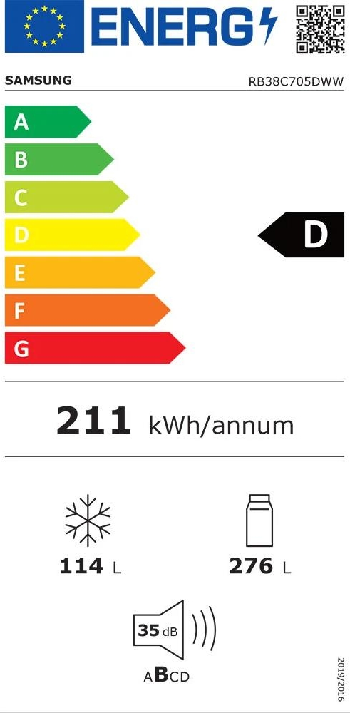 Kombinovaná chladnička Samsung s beznámrazovým systémem a možností propojení přes chytrý telefon. Energetická třída D, LED osvětlení a celkový objem 390 litrů.