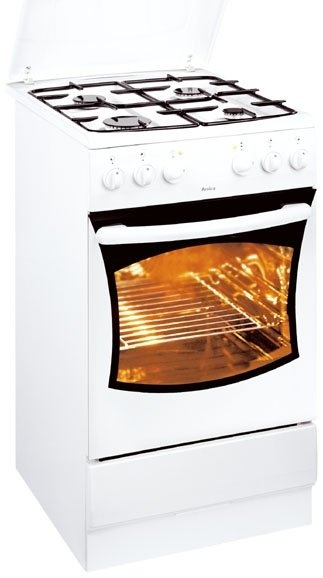 Kombinovaný sporák Amica s bezpečnostní pojistkou hořáků, grilem a nerezovými bočními vodícími lištami plechů.