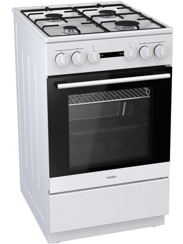 Sporák Mora s elektrickou troubou a plynovou varnou deskou se 4 hořáky. Energetická třída A a celkový objem troby 68 litrů.