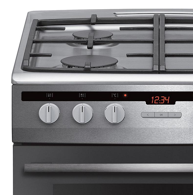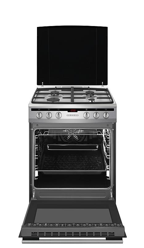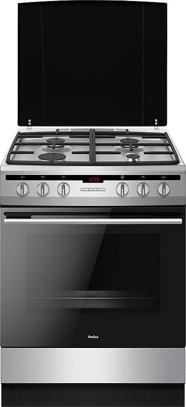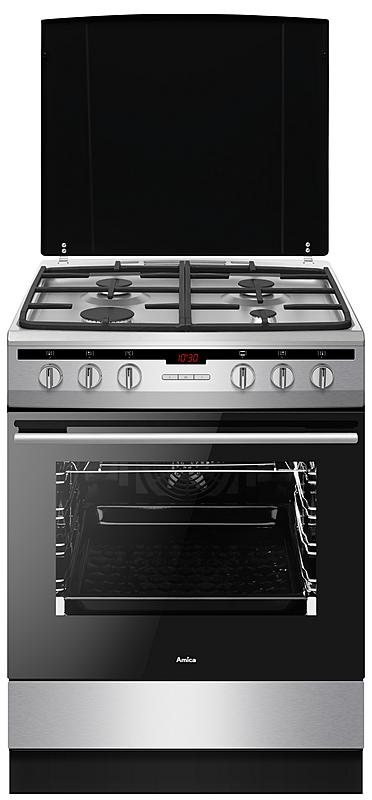 Kombinovaný sporák Amica s 10 funkcemi trouby, litinovými rošty a cirkulací horkého vzduchu. Energetická třída A a bezpečnostní pojistka hořáků.