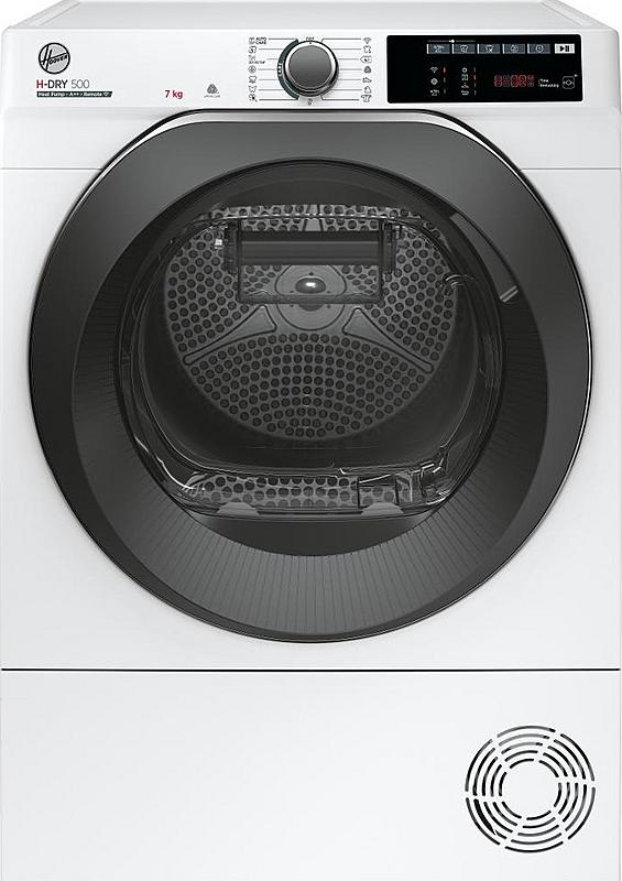 Kondenzační sušička prádla Hoover s tepelným čerpadlem, možností ovládání přes aplikaci a senzorovým sušením. Kapacita 7 kg prádla a hloubka jen 46,5 cm.