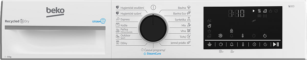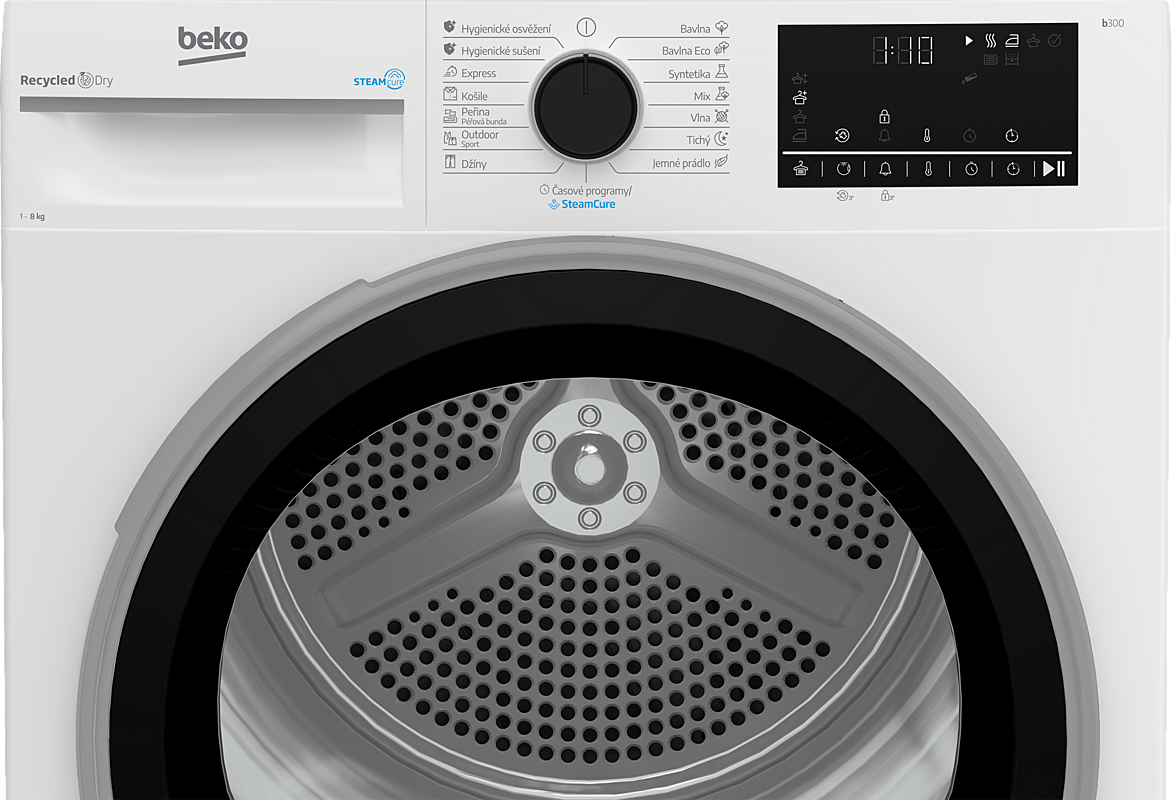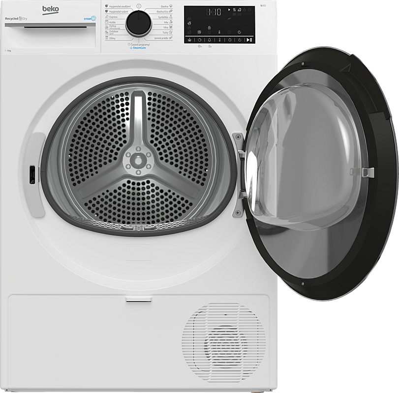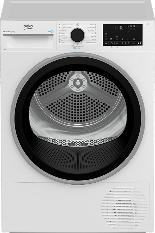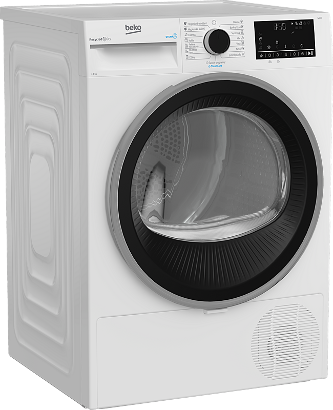 Kondenzační sušička Beko na 8 kg prádla s tepelným čerpadlem, invertorovým motorem a senzorovým sušením. Možnost otočení dveří a ochrana proti zmačkání prádla.