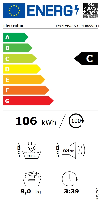 Sušička prádla Electrolux s tepelným čerpalem a senzorovým sušením. Energetická třída C, invertorový motor a celková kapacita 9 kilogramů prádla.