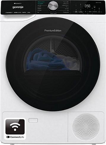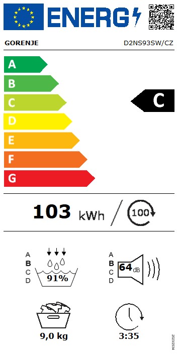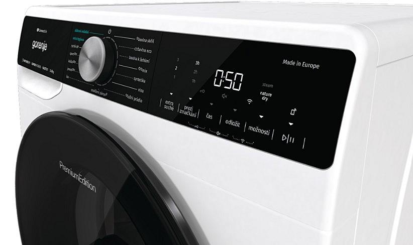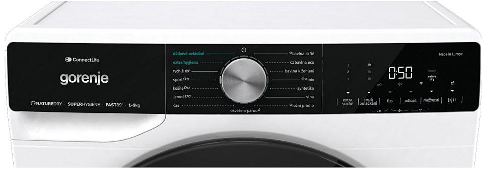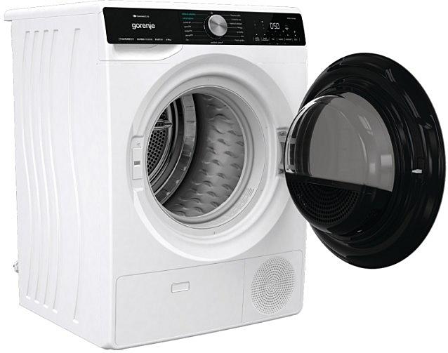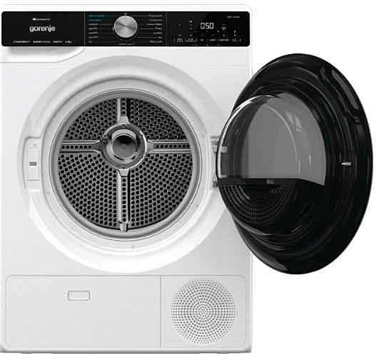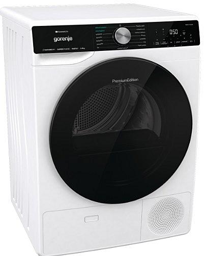 Kondenzační sušička Gorenje s tepelným čerpadlem, invertorovým motorem a senzorem vlhkosti. Kapacita 9 kg prádla, 15 programů a energetická třída C.