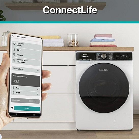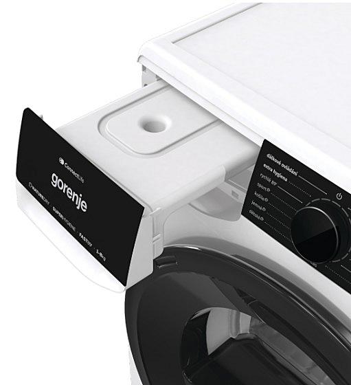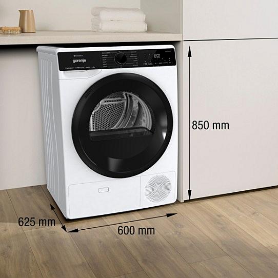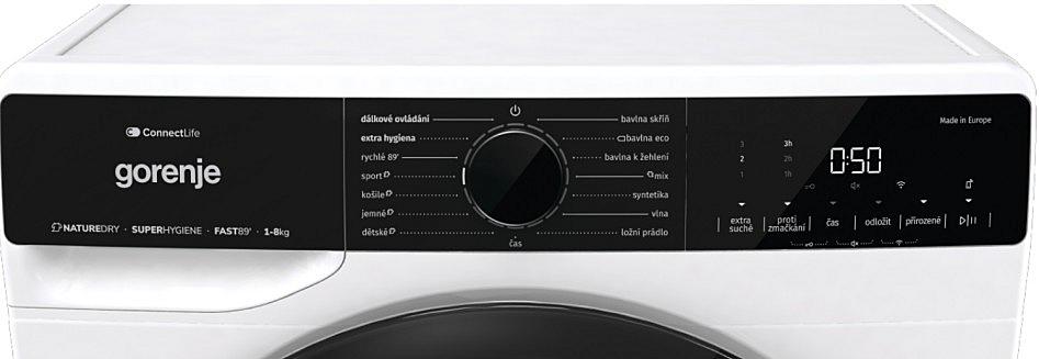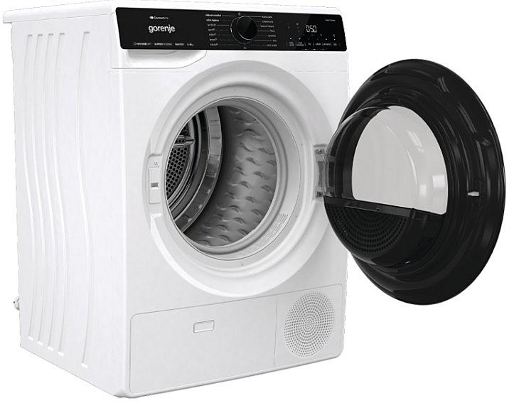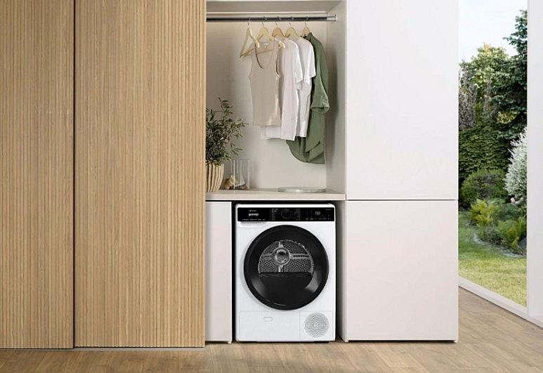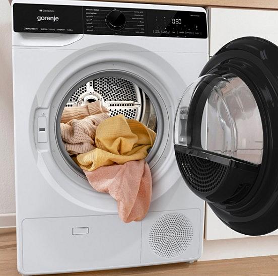 Kondenzační sušička Gorenje s tepelným čerpadlem, možností ovládání přes WiFi a 15 programy. Kapacita 8 kg prádla, senzory vlhkosti a energetická třída C.