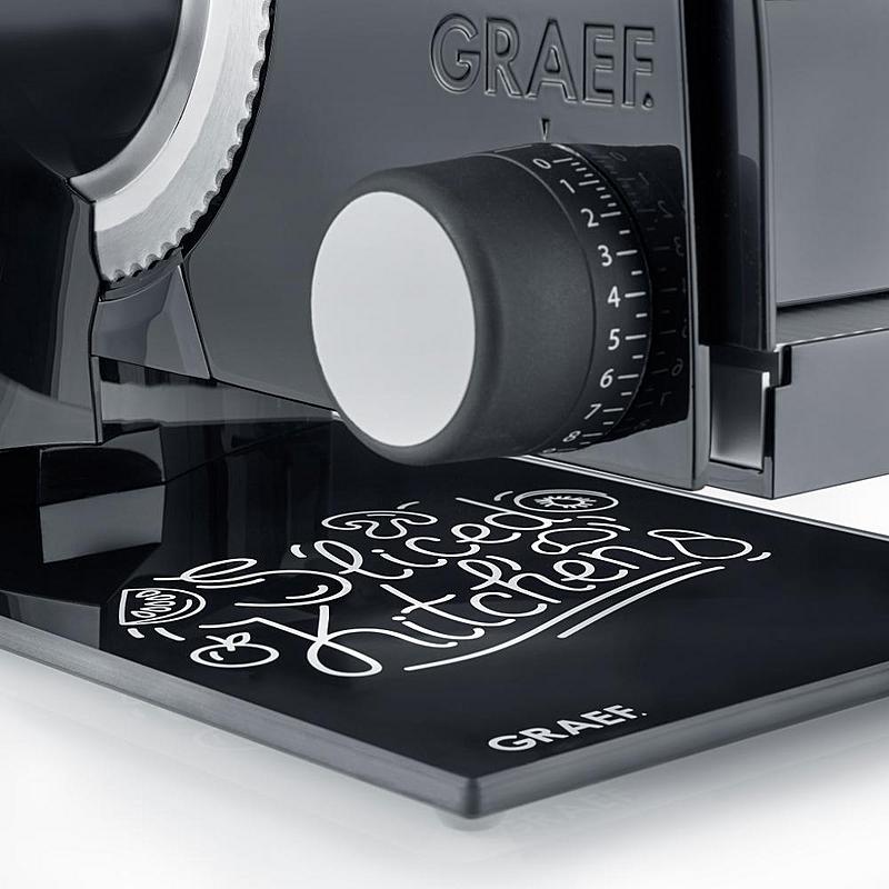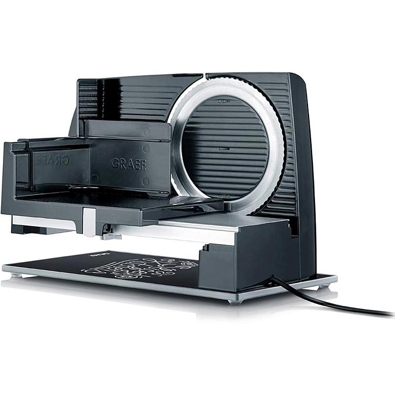 Elektrický kuchyňský kráječ Graef s tloušťkou krájení do 20 mm a bezpečnostním odnímatelným krytem.