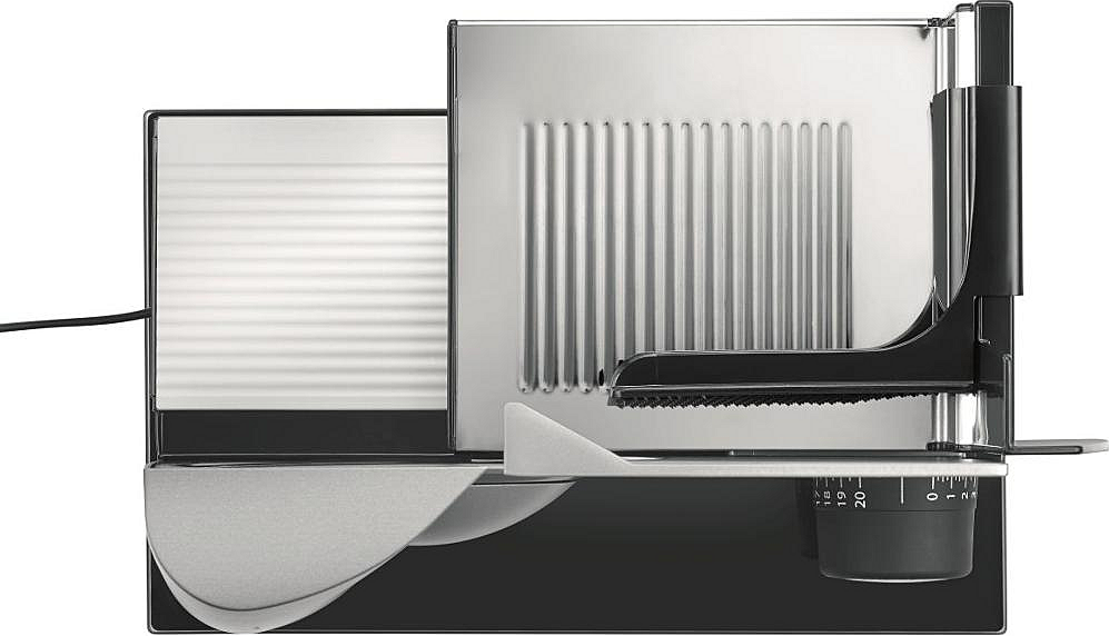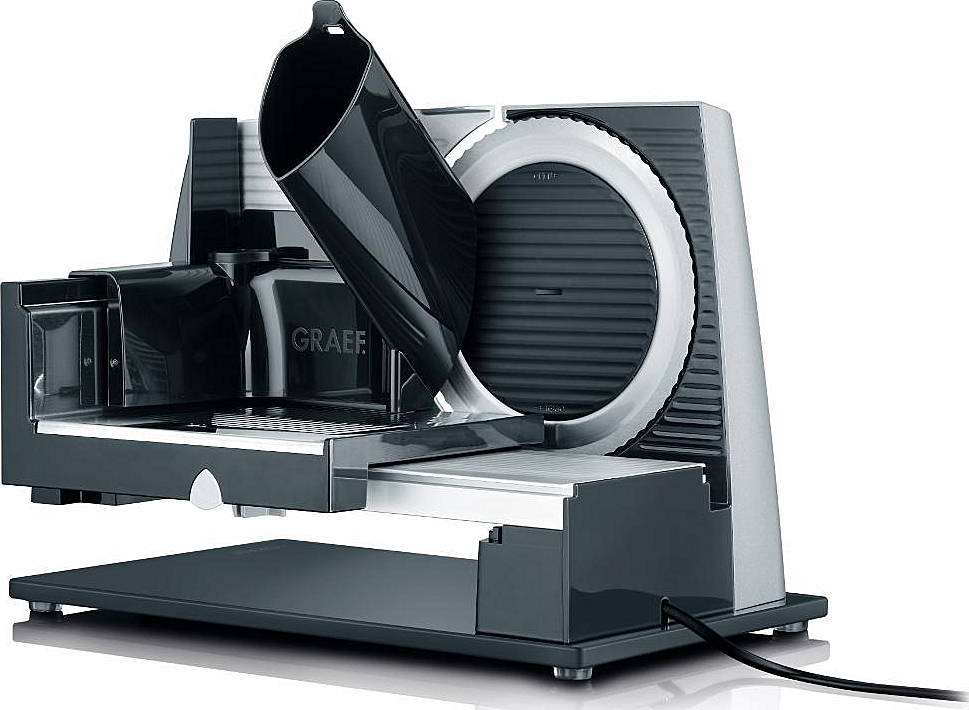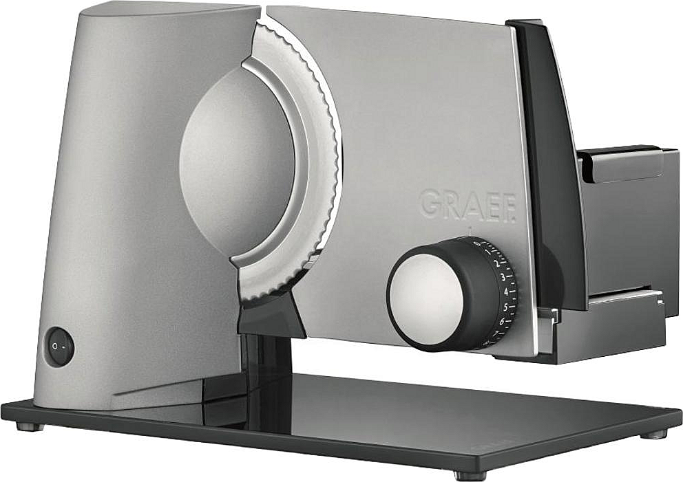 Kuchyňšký kráječ Graef s maximální šířkou plátu 20 mm, ochranou prstů a příkonem 170 W.