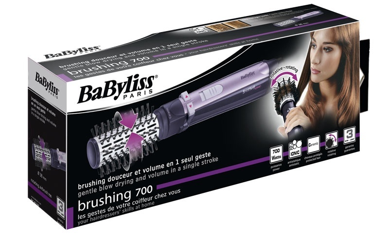 Vysoušecí a rotační kartáč BaByliss s keramickou rotační hlavou o průměru 38 mm.