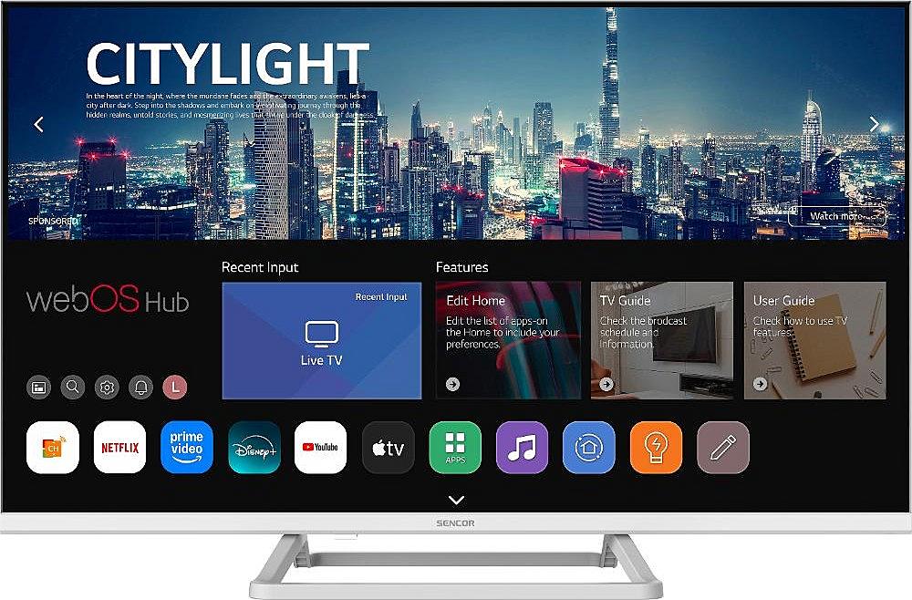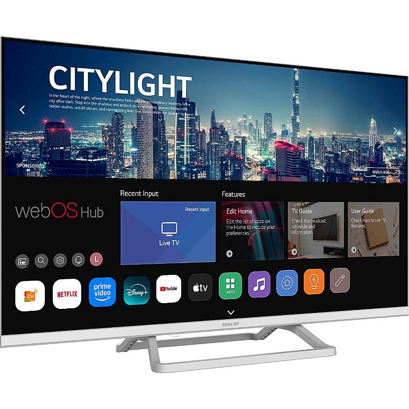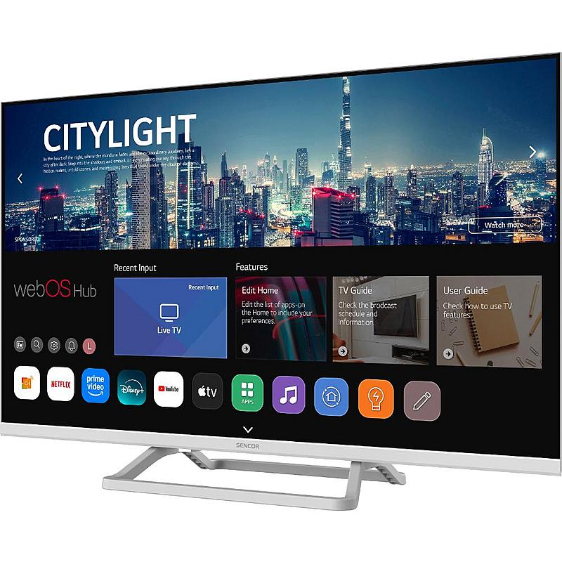 Smart LED televizor Sencor v elegantním bílém provedení. HD Ready rozlišení, operační systém WebOS a Hbb Tv.