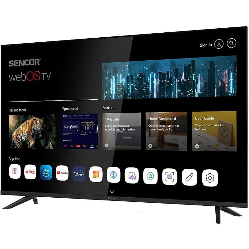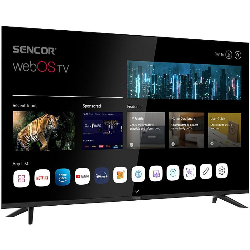 Chytrý LED televizor Sencor s úhlopříčkou 109 centimetrů a hlasovým asistentem. Energetická třída E, Bluetooth zukovým výkonem 16 W.