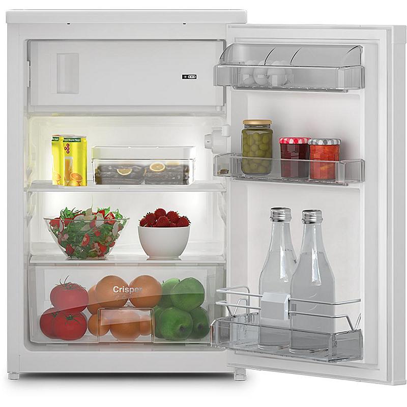 Jednodveřová lednice s mrazákem Whirlpool s možností otočení otevírání dveří a LED osvětlením. Celkový objem 114 l a mechanické ovládání.