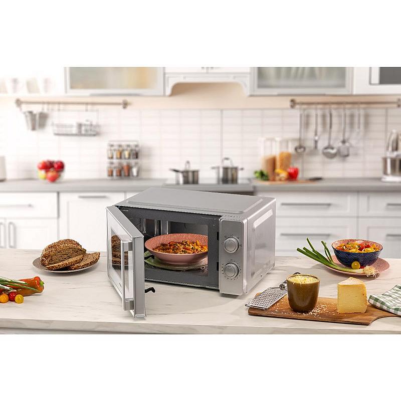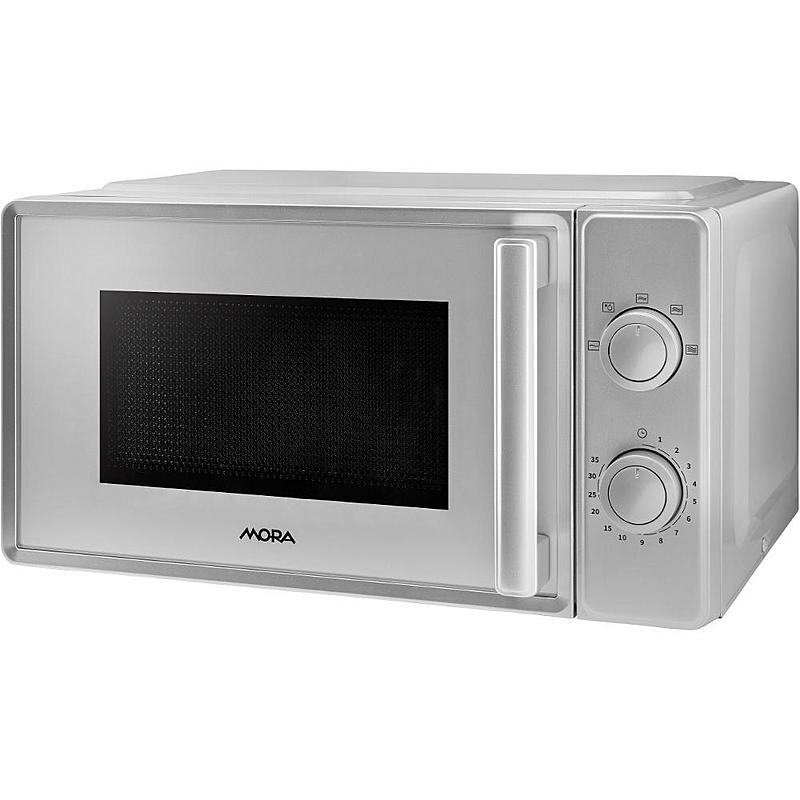 Mikrovlnná trouba Mora s mechanickým ovládáním, časovačem, funkcí rozmrazování a pěti úrovněmi výkonu. Objem 20 l a lakovaný vnitřek.