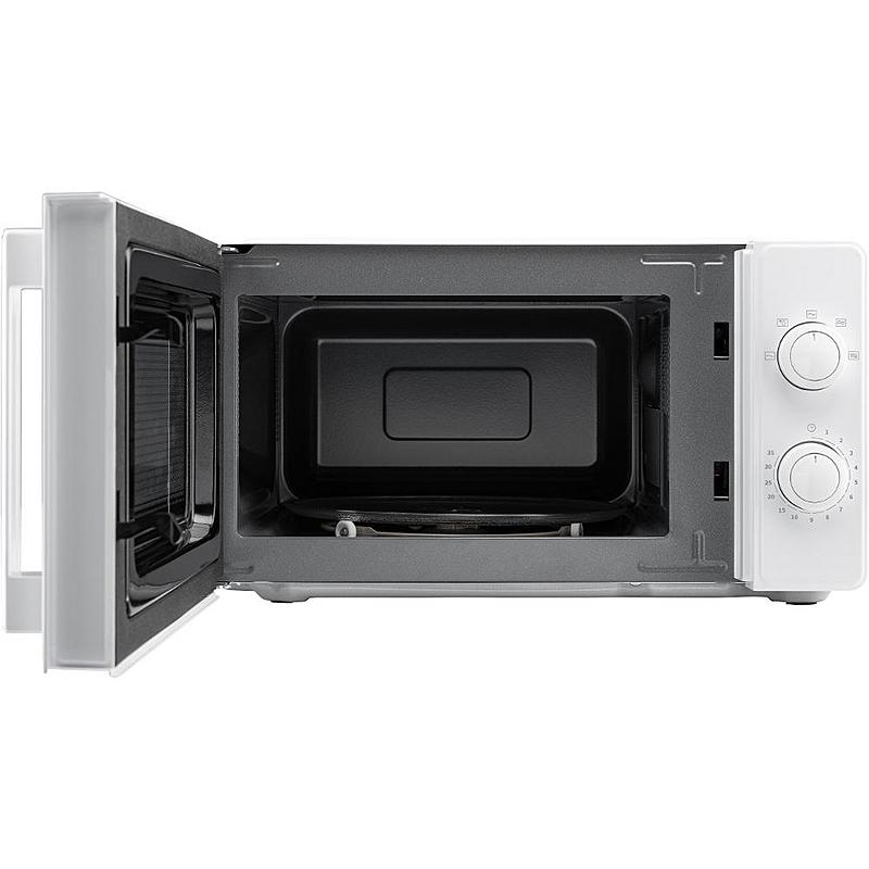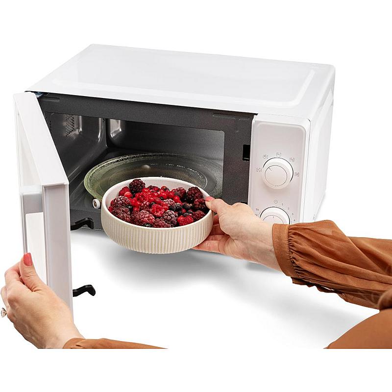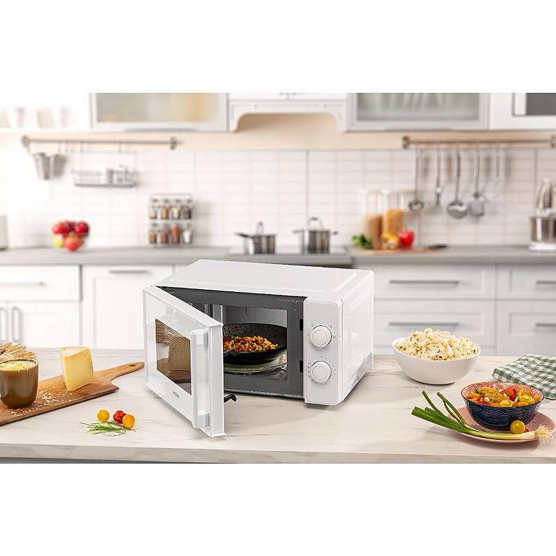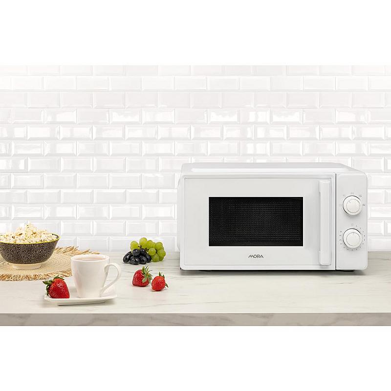 Mikrovlnná trouba Mora s mechanickým ovládáním, časovačem, funkcí rozmrazování a pěti úrovněmi výkonu. Objem 20 l a lakovaný vnitřek.