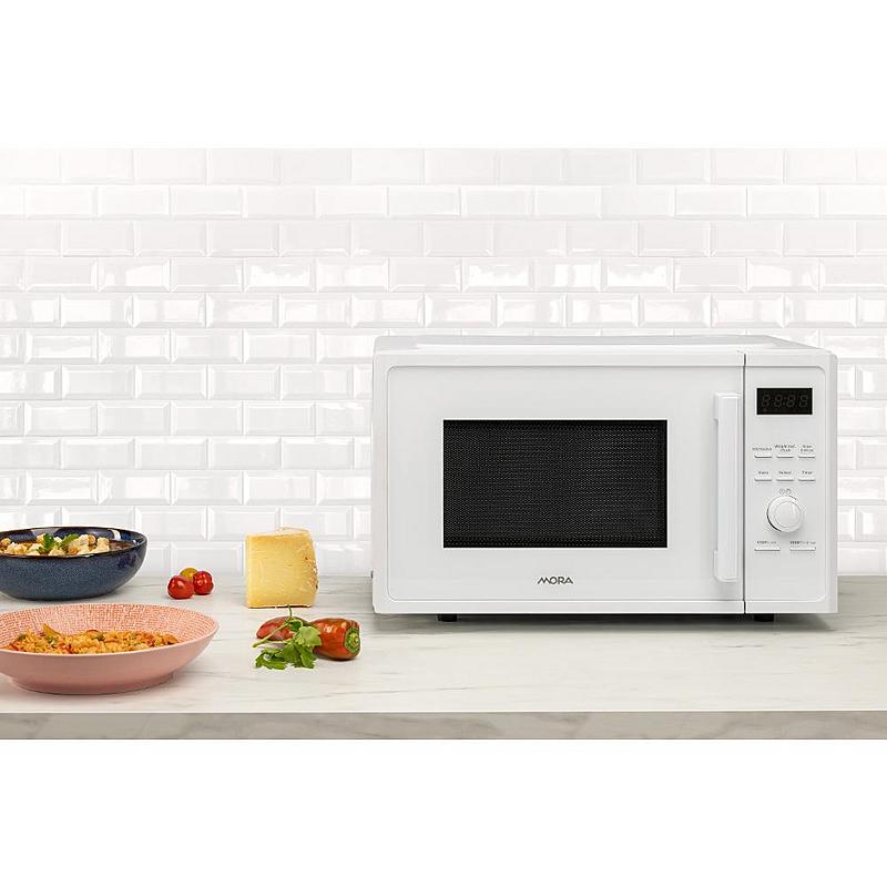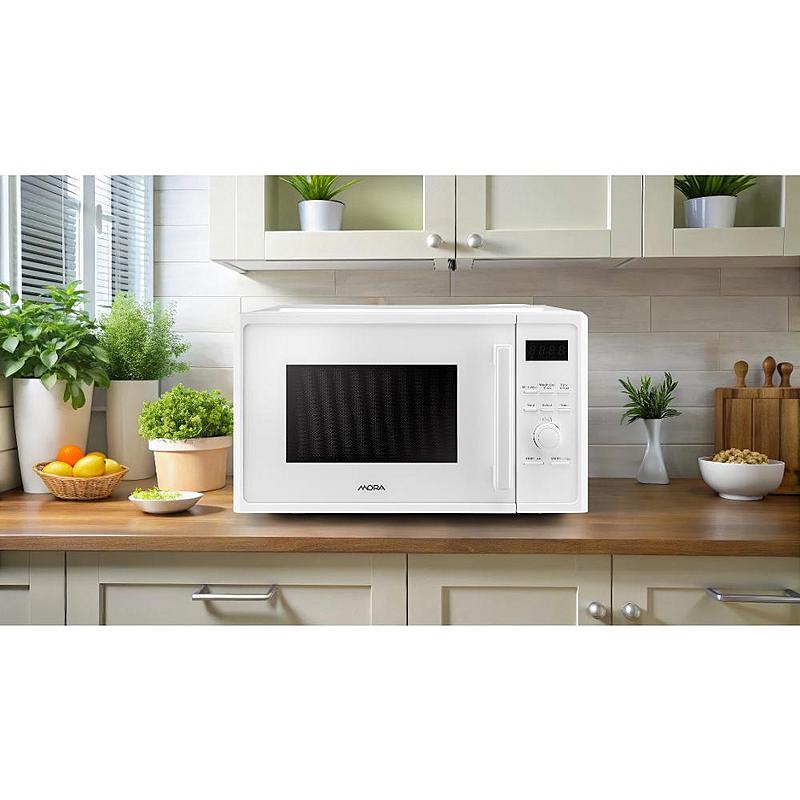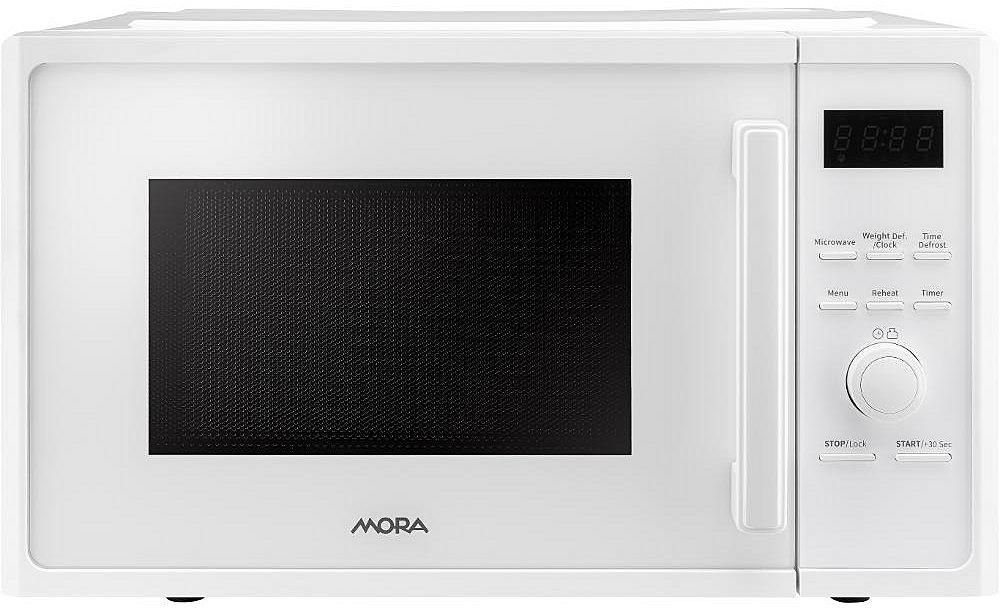 Mikrovlnná trouba Mora s časovačem, funkcí rozmrazování a 8 přednastavenými programy. Objem 23 l a jednoduché a srozumitelné ovládání.