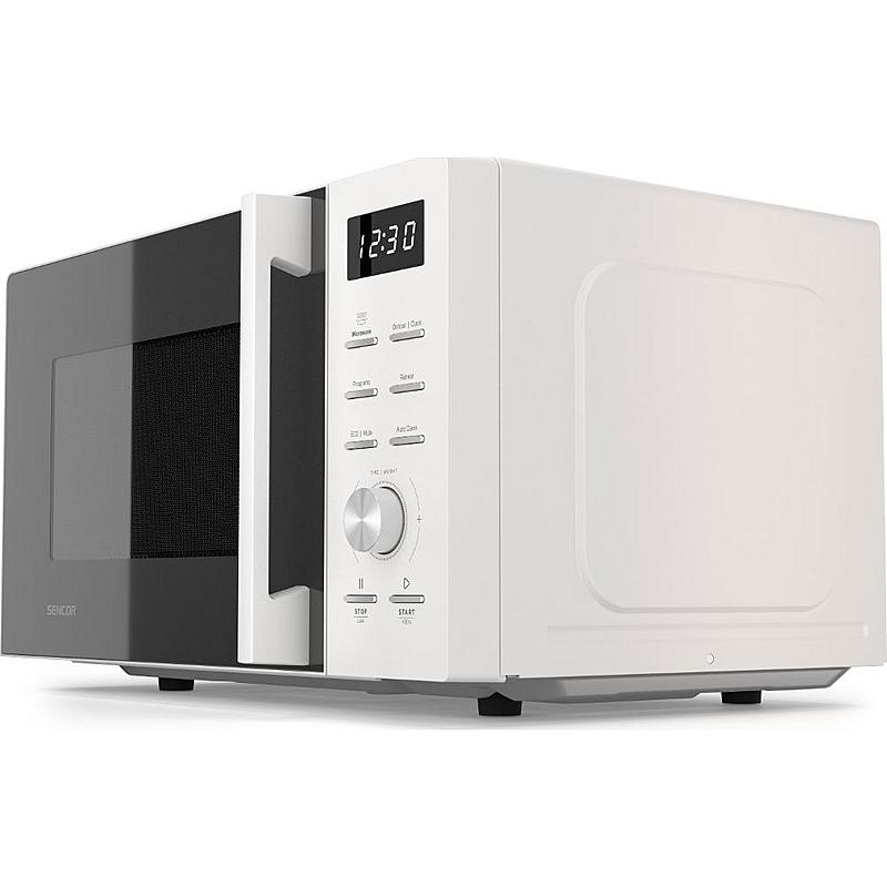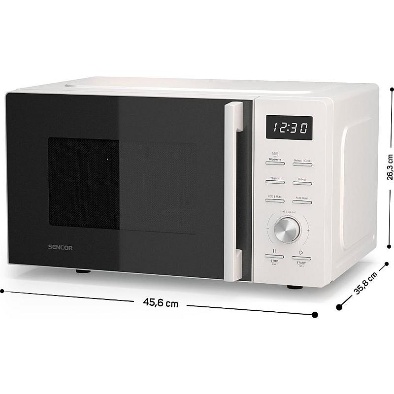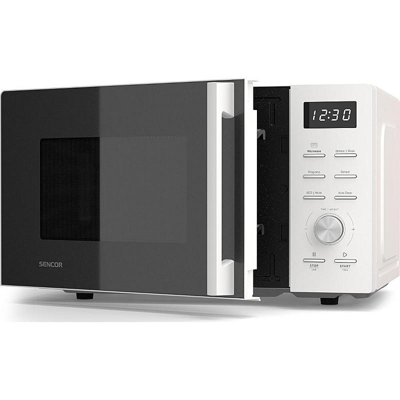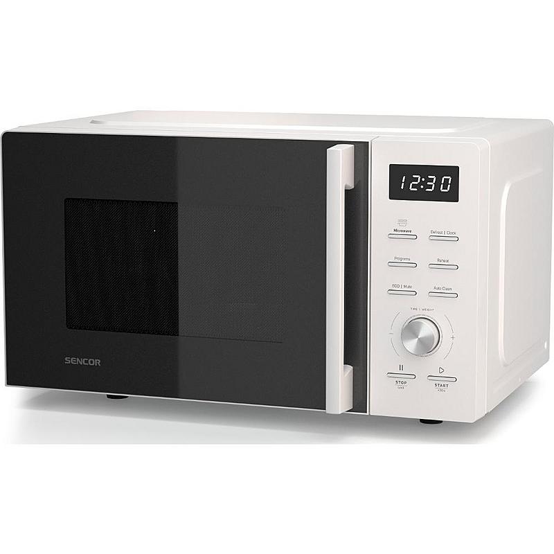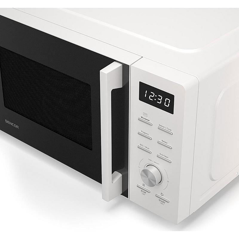Mikrovlnná trouba Sencor s elektronickým ovládáním, LED displejem se zobrazení hodin a rozmrazováním. Objem 20 l a 8 přednastavených programů.