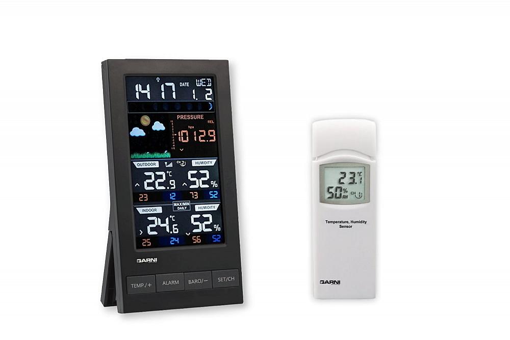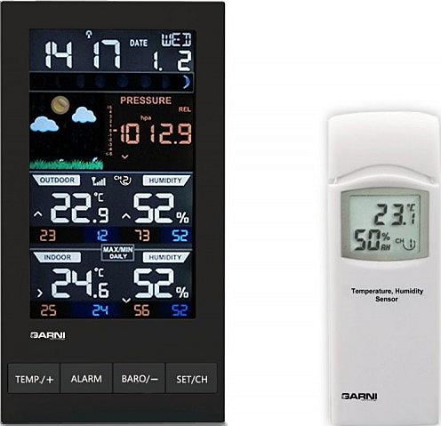 Meteostanice Garni s vlhkoměrem, barometrem a funkcí Snooze.