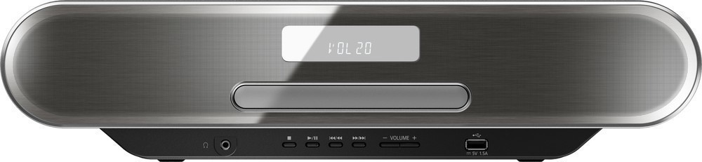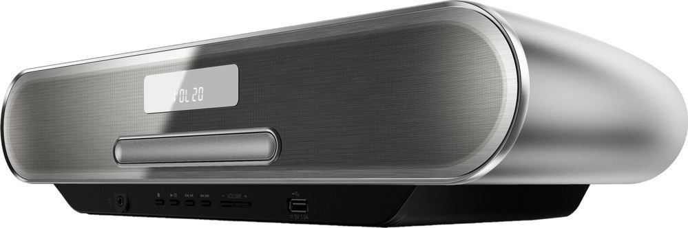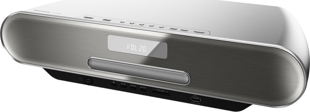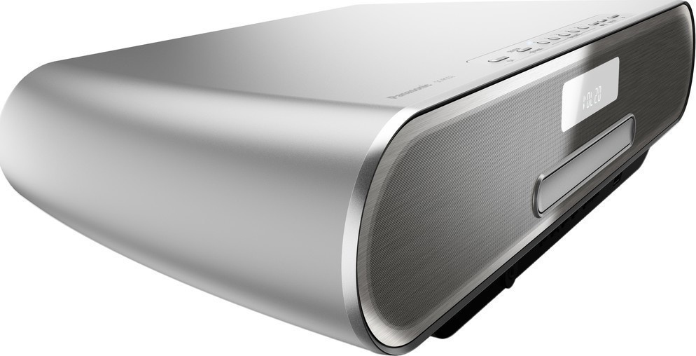 Bezdrátový audio systém Panasonic s CD přehrávačem, Bluetooth, automatickým laděním FM stanic a dvěma reproduktory s celkovým výkonem 40 wattů.