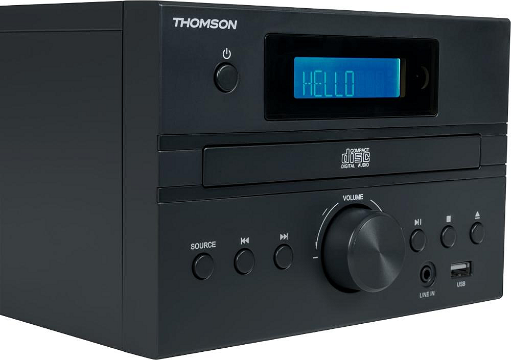 Mikrosystém Thomson s přehrávačem CD, MP3, bezdrátovým přehráváním a FM rádiem.