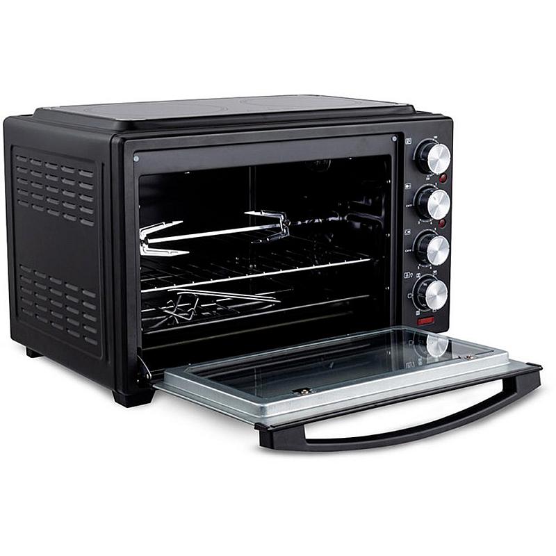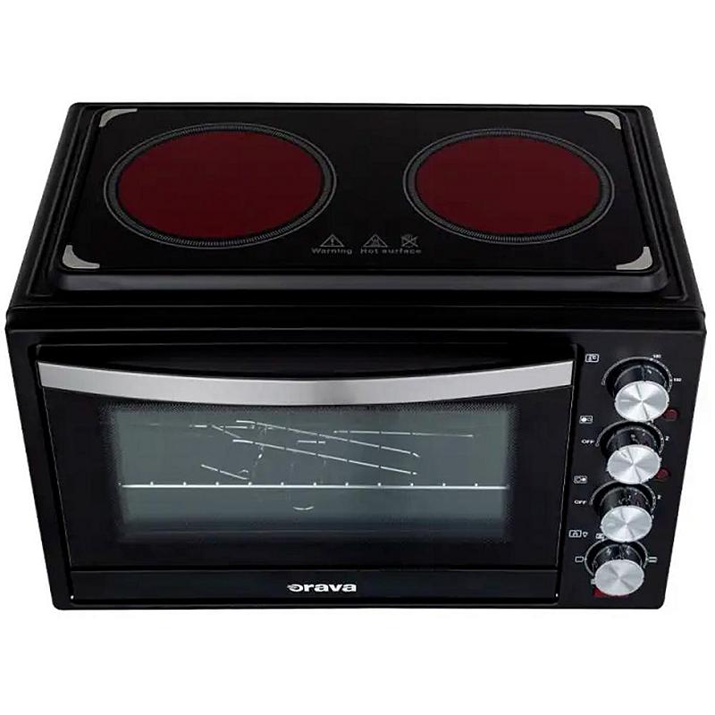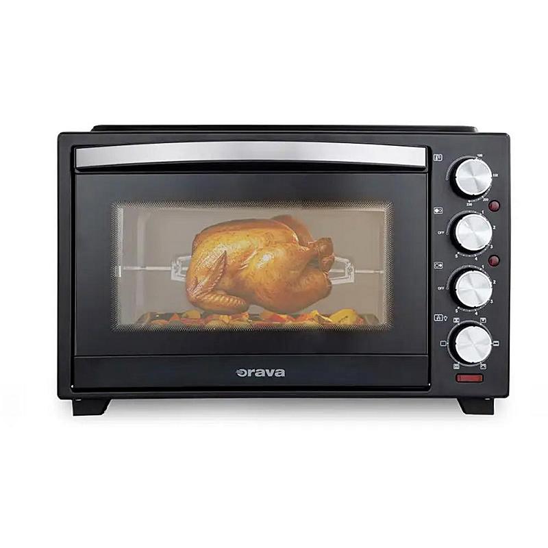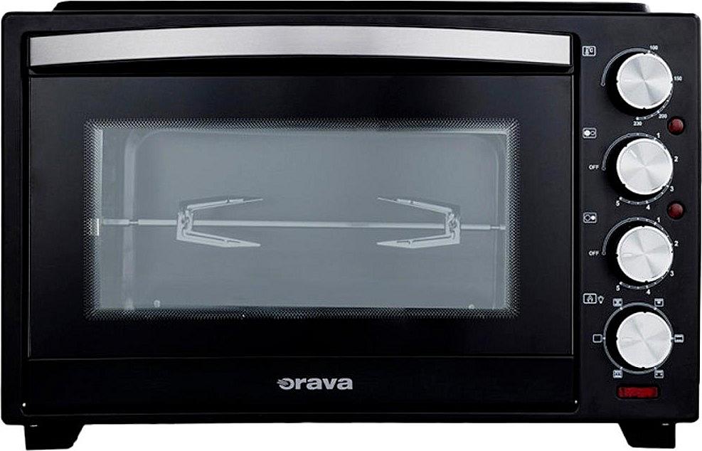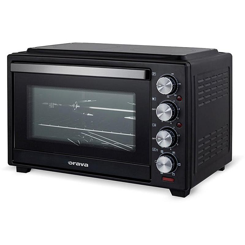 Minitrouba Orava s keramickou dvojplotnou, ventilátorem, grilem a objemem 38 l. Grilovací otočný rošt a plynulá regulace teploty.