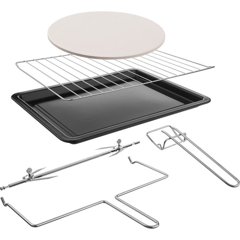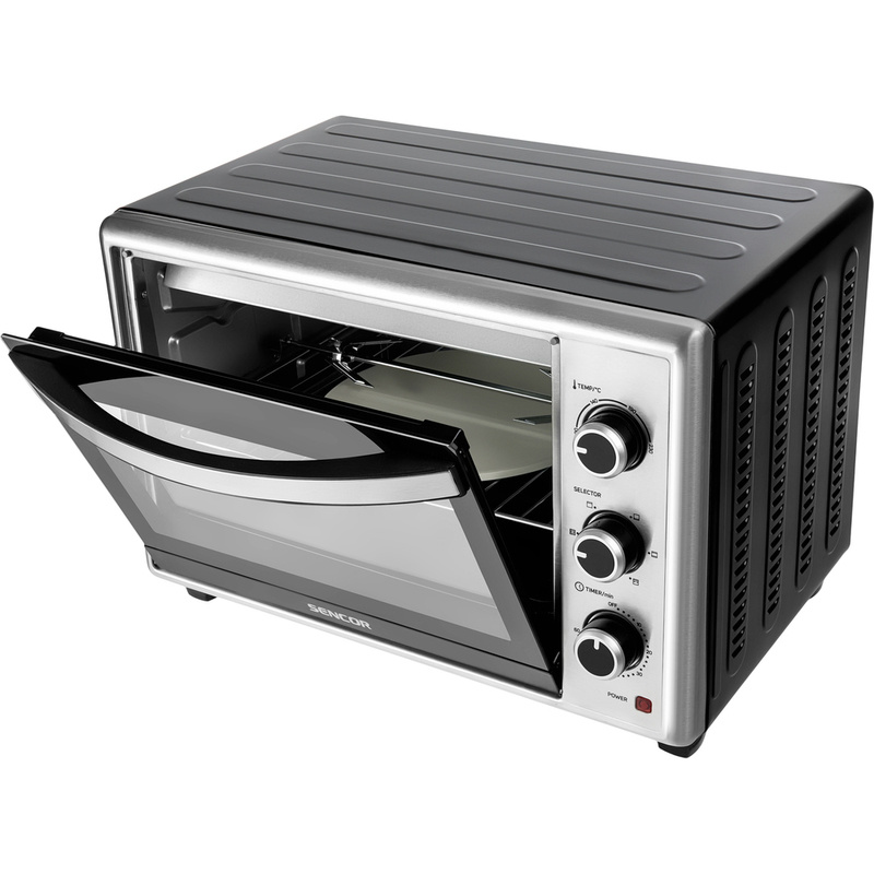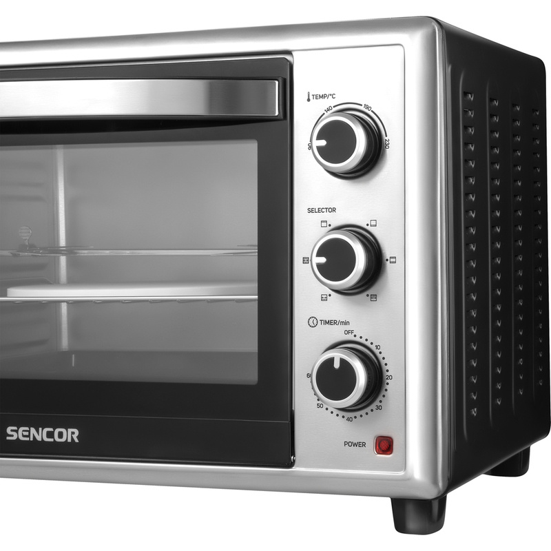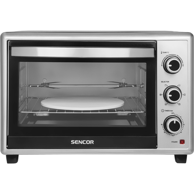 Elektrická trouba Sencor s objemem 36 l, časovačem, 6 programy a kamenem na pizzu.