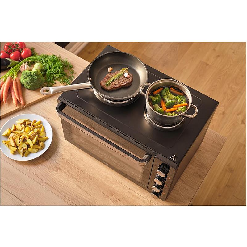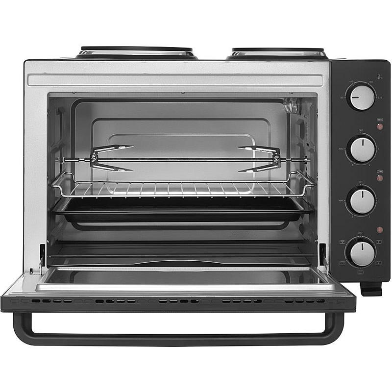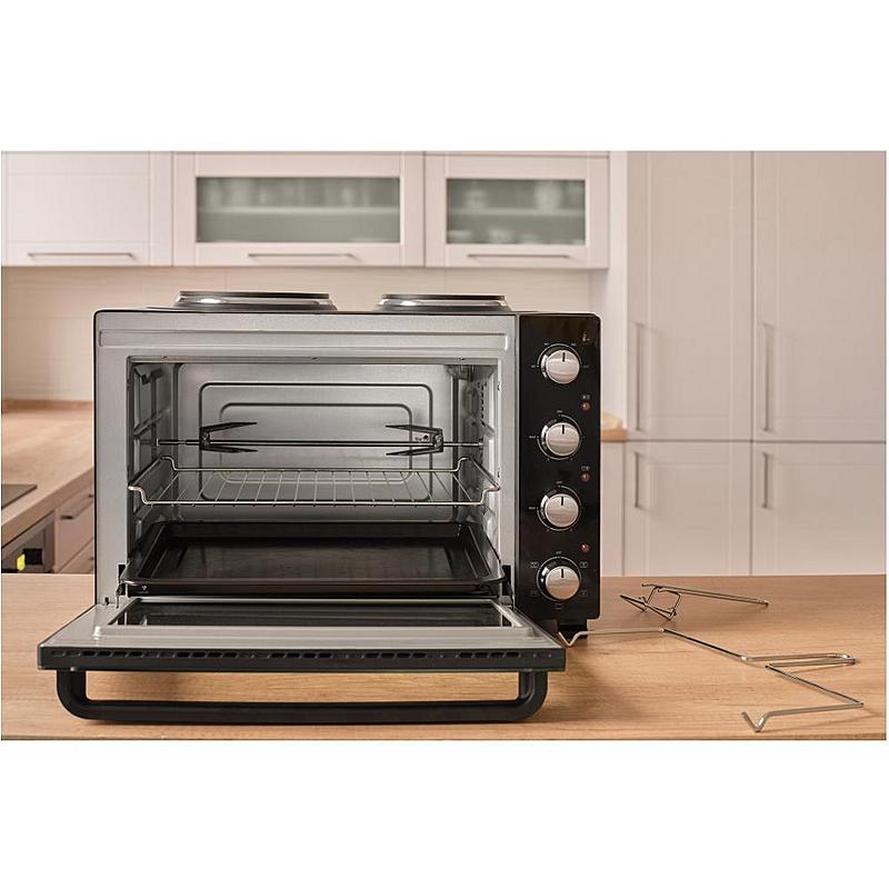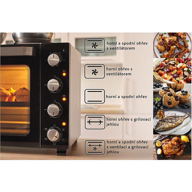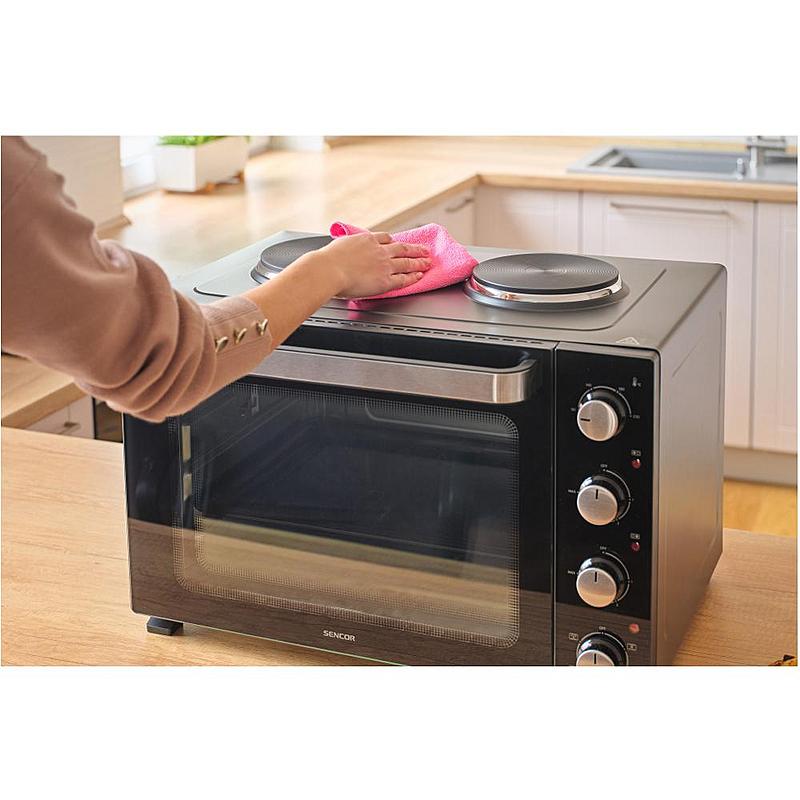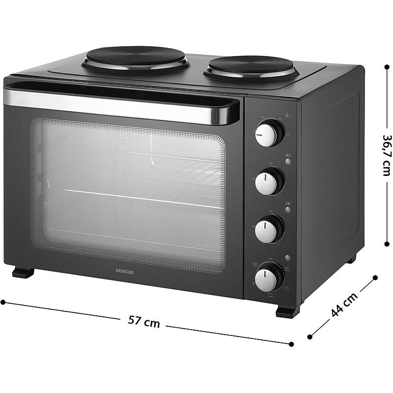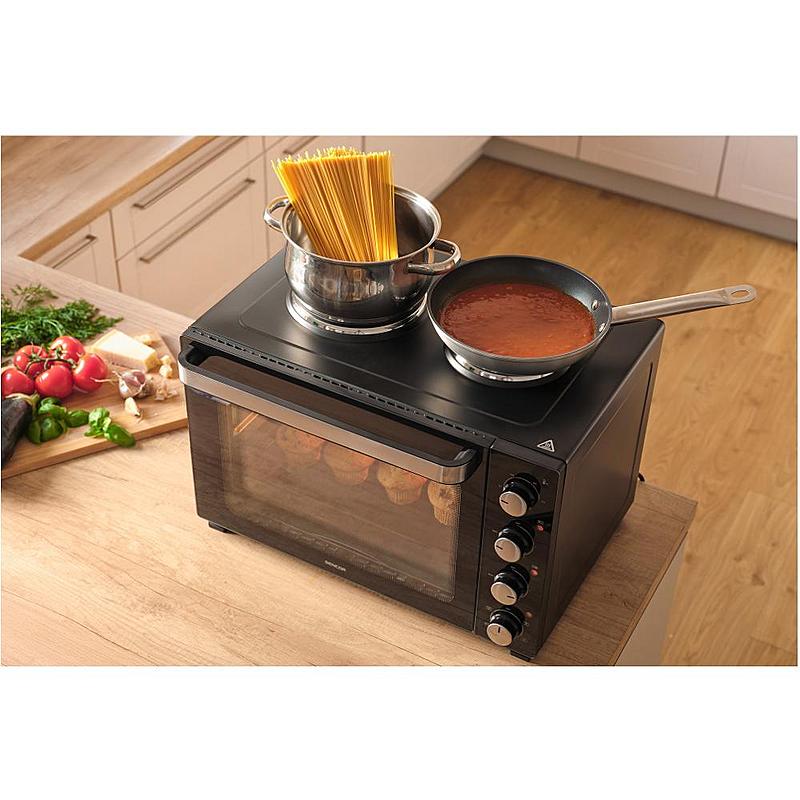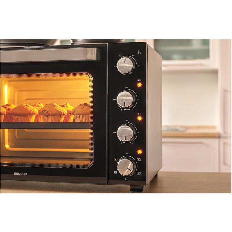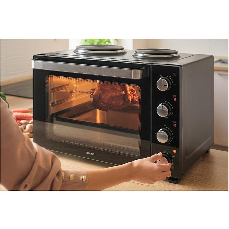Elektrická trouba s plotýnkami Sencor s objemem 48 l, integrovaným vnitřním osvětlením a 5 programy. Otočný rožeň a plynulá regulace teploty.