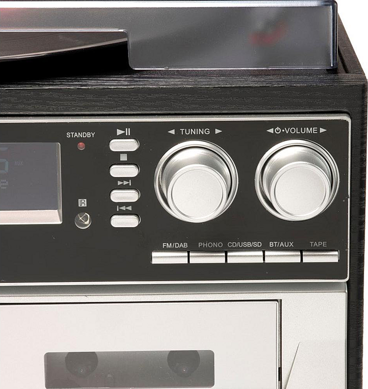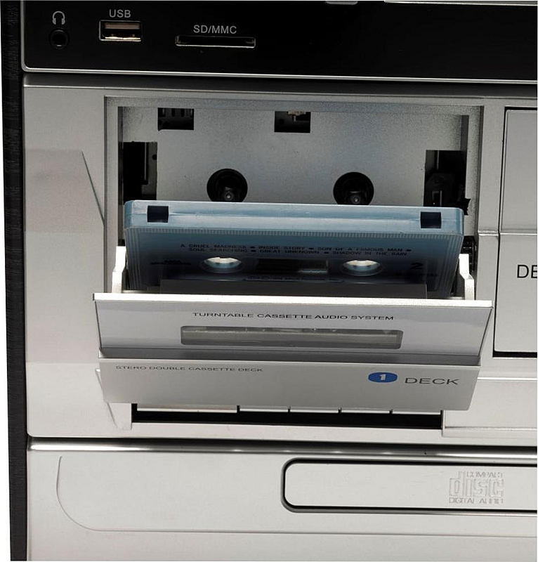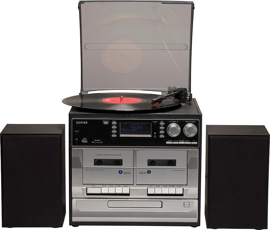 Minisystém Denver s gramofonem, kazetovým přehrávačem, CD a MP3 přehrávačem se vstupem pro USB a SD kartu.