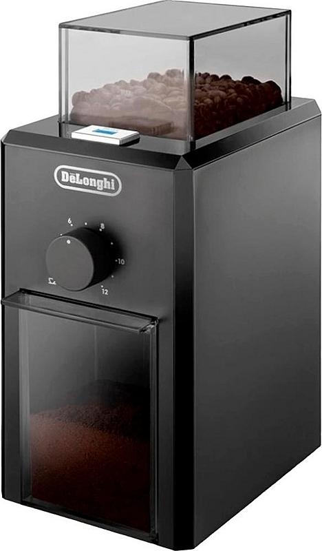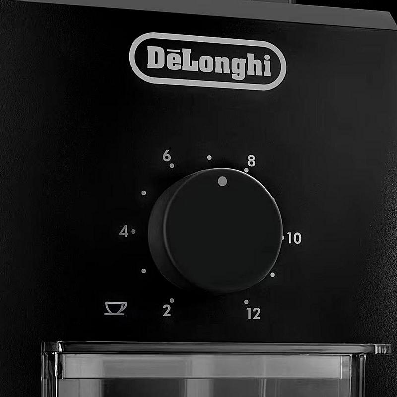 Kávomlýnek DeLonghi s mlecími kameny a možností nastavení hrubosti mletí.