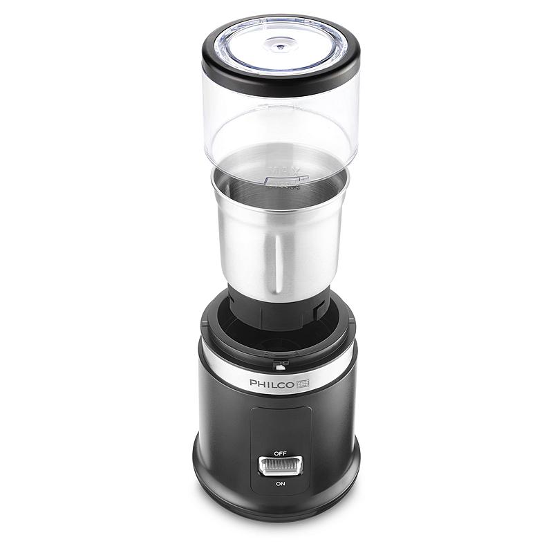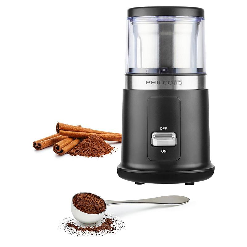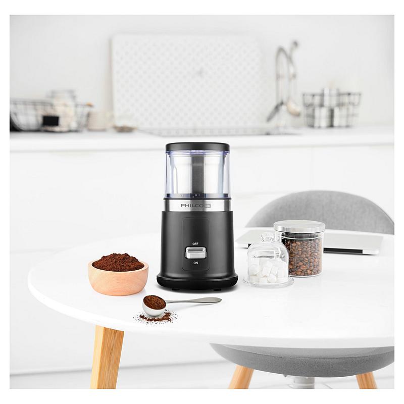 Multifukční mlýnek Philco pro mletí kávy, koření, semínek, ořechů či bylinek. Nerezová nádoba s mlecí kapacitou 50 g a výkonný měděný motor.