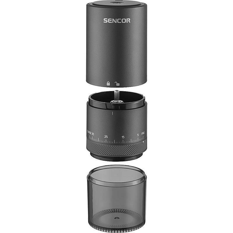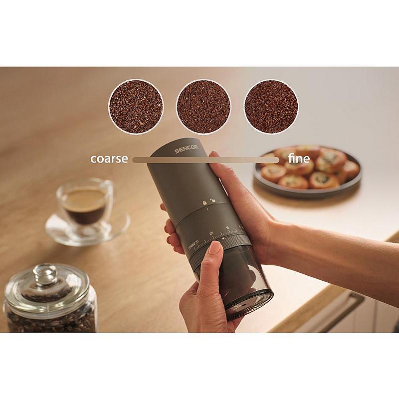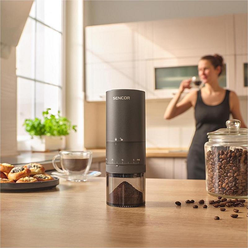 Bezdrátový mlýnek na kávu Sencor s regulací hrubosti mletí, možností mletí během nabíjení a kapacitou kávových zrn 25 g.