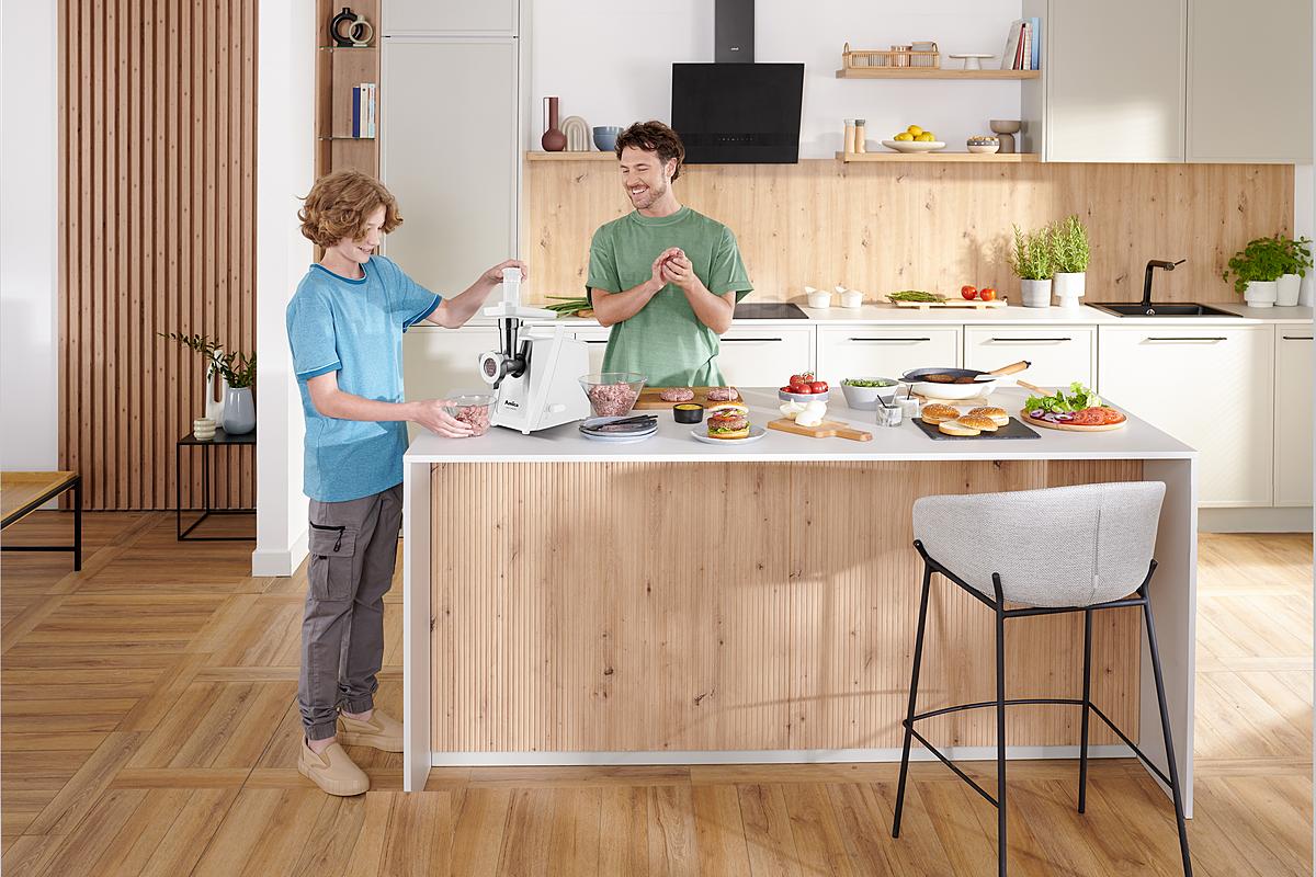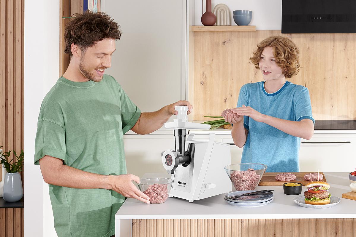 Mlýnek na maso Amica s velkým plnícím otvorem, ochranou proti přetížení a nástavcem na klobásy a kebbe.