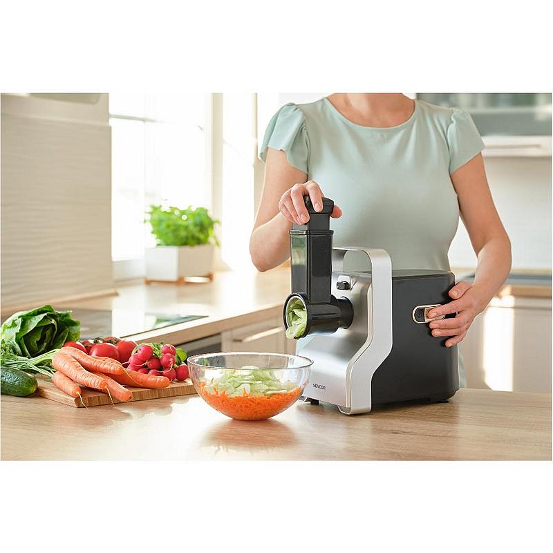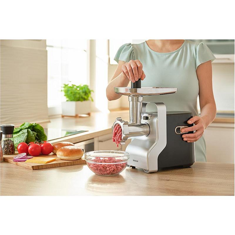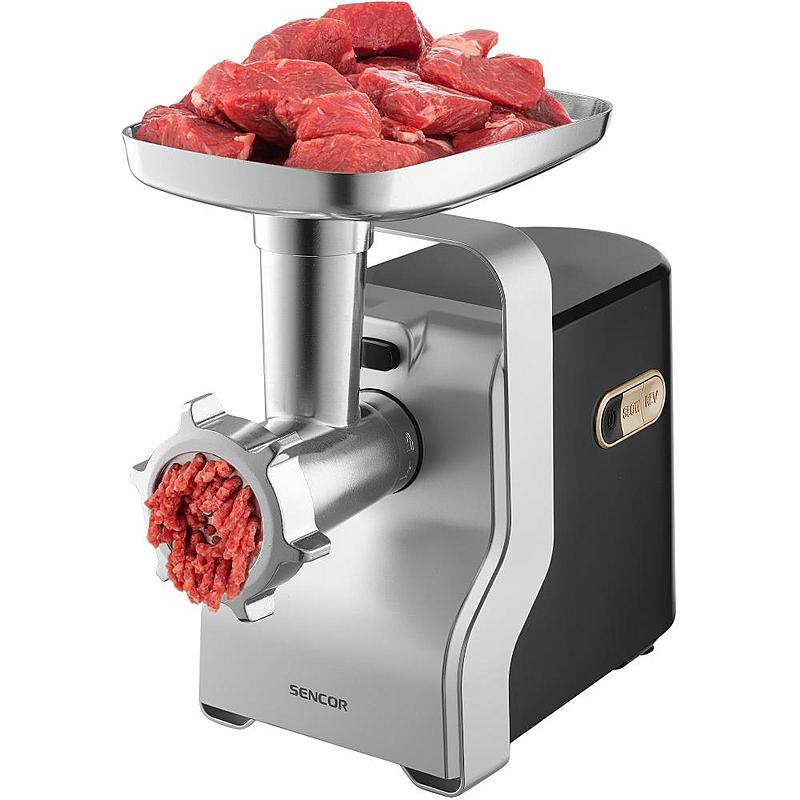Mlýnek na maso Sencor se 3 mlecími disky, nástavcem na klobásy a výkonem motoru až 2100 W.