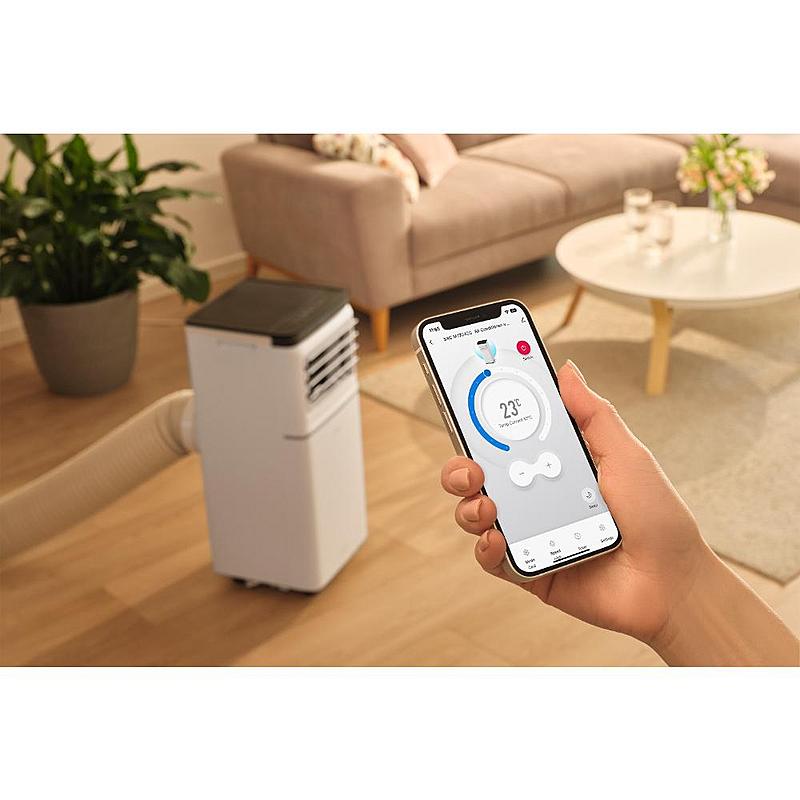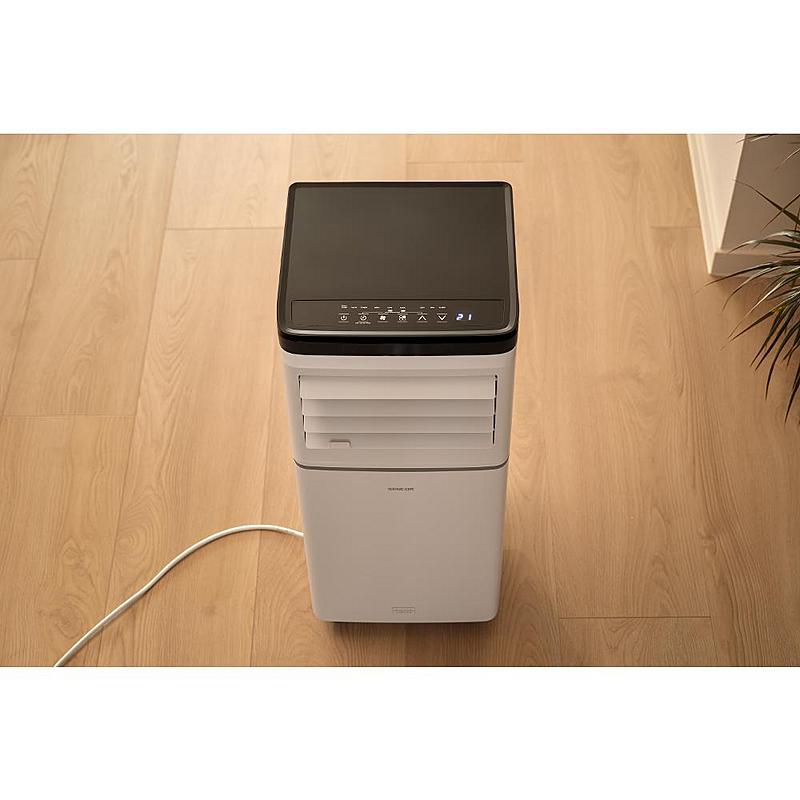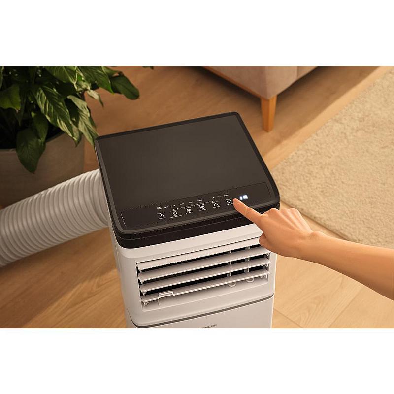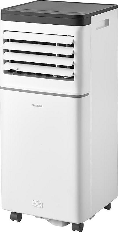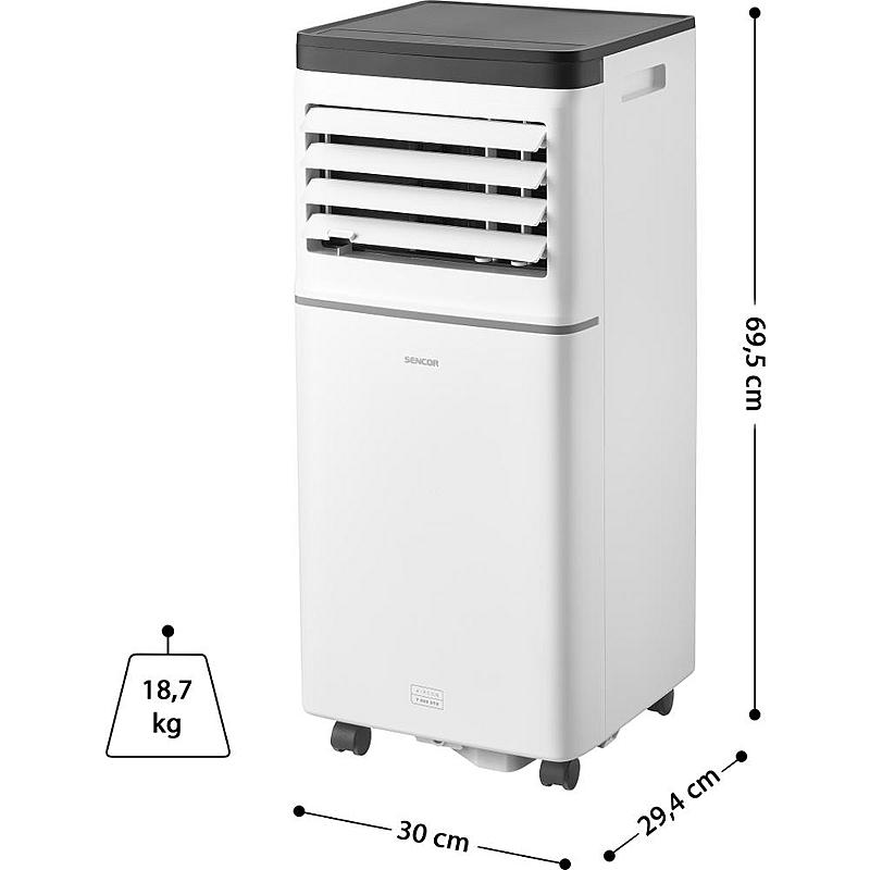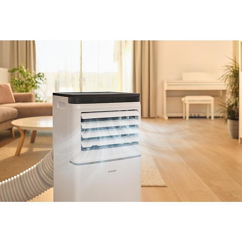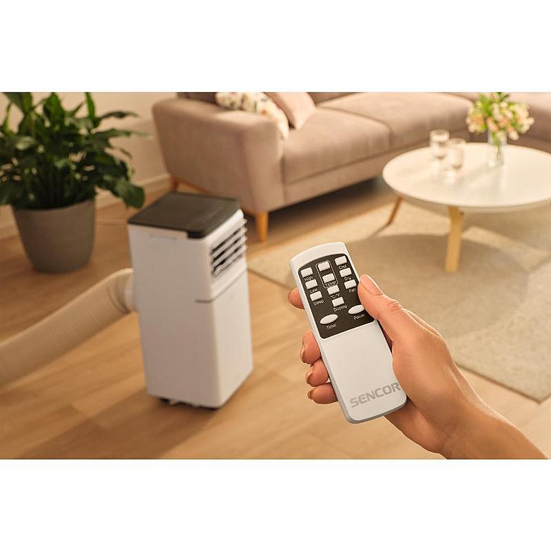 Mobilní klimatizace Sencor s možností ovládání přes aplikaci i dálkovým ovládáním, výkonem 7000 BTU/h a třemi režimy.