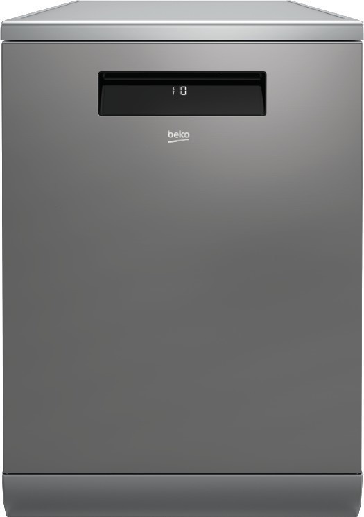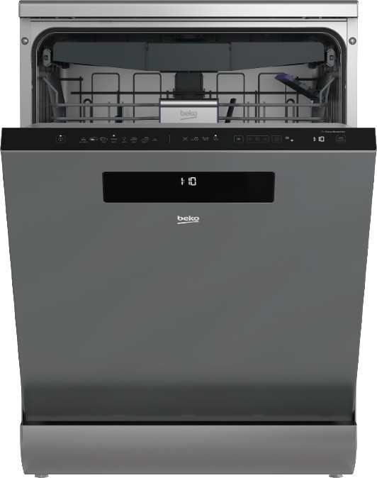 Myčka nádobí Beko s funkcí odloženého startu a invertorovým motorem. Energetická třída D, 8 mycích programů a celková kapacita 15 souprav nádobí.