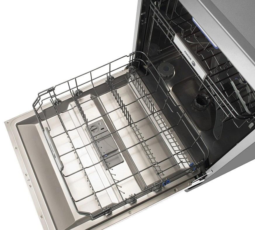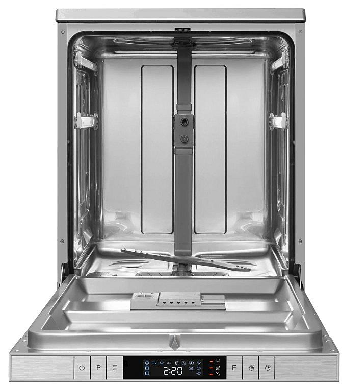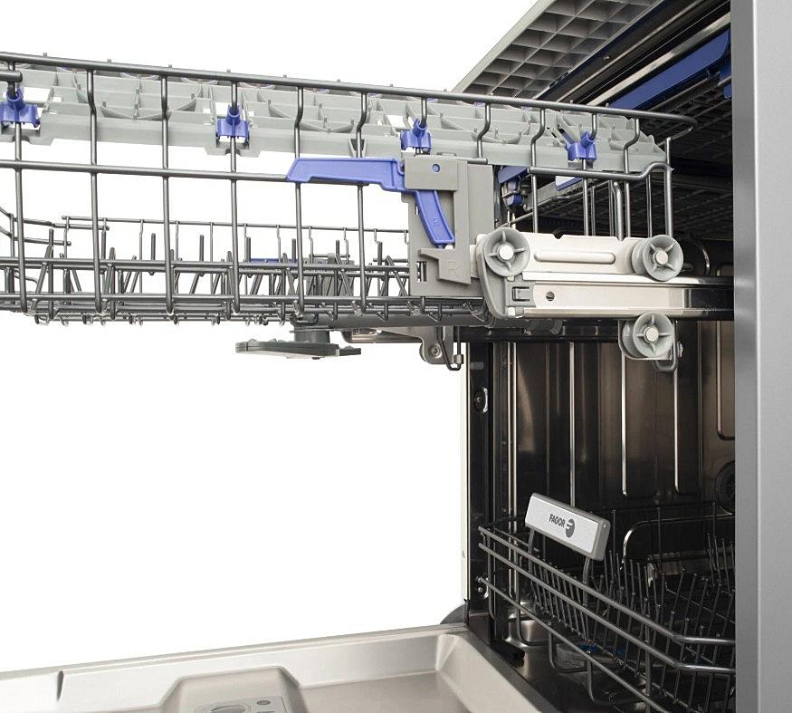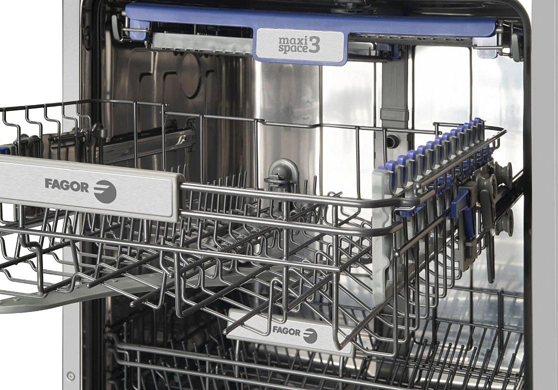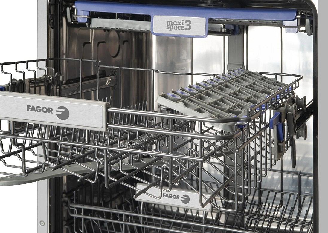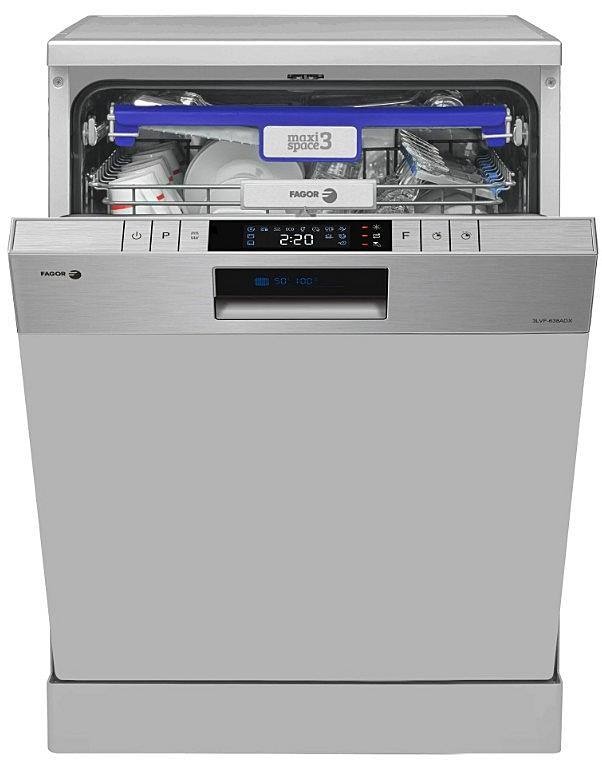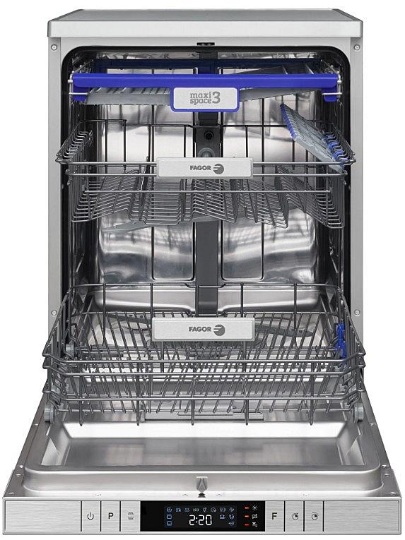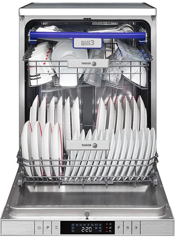 Volně stojící myčka nádobí Fagor s automatickým otevíráním dveří, 8 programy a Aquastopem. Energetická třída D a kapacita 14 sad nádobí.