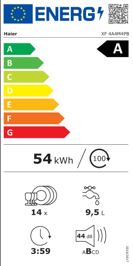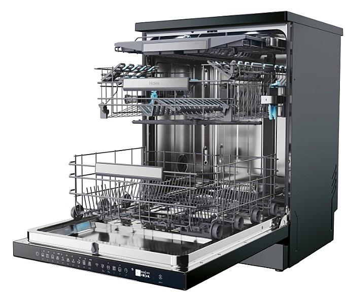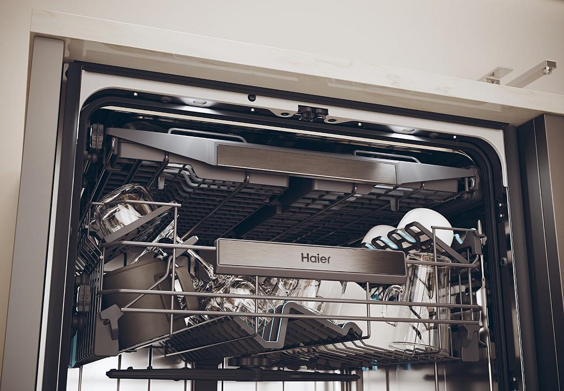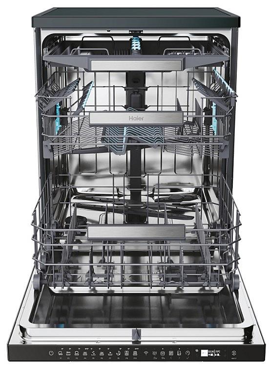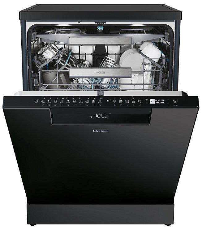 Myčka nádobí Haier se smart senzorem, invertorovým motorem a 10 programy. Energetická třída A, kapacita 14 sad nádobí a automatické otevření dveří.