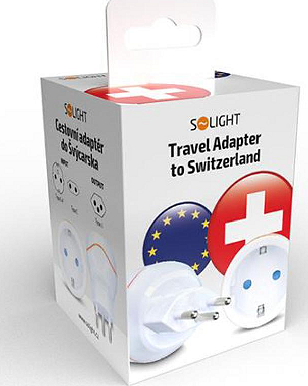 Cestovní adaptér Solight pro zásuvky typu J ve Švýcarsku.