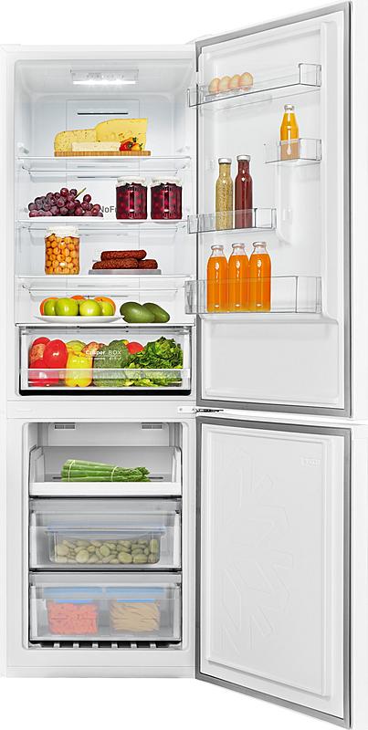 Beznámrazová kombinovaná lednice Amica s možností otočení otevírání, LED osvětlením a elektronickým ovládáním termostatu. Celkový objem 322 l a alarm otevřených dveří.
