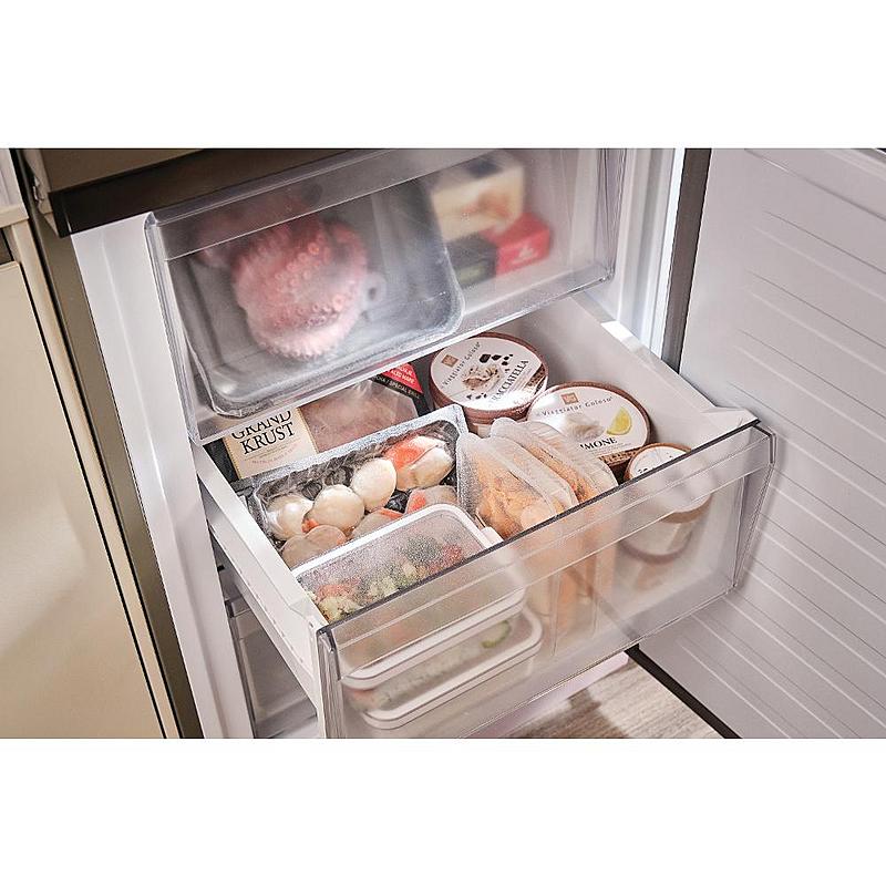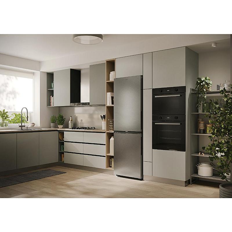 Beznámrazová kombinovaná lednice Candy s nulovou zónou, LED osvětlením a možností ovládání přes aplikaci. Energetická třída A a celkový objem 355 l.