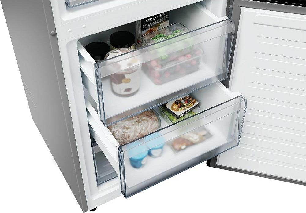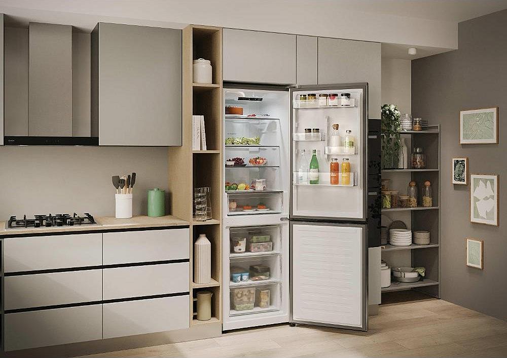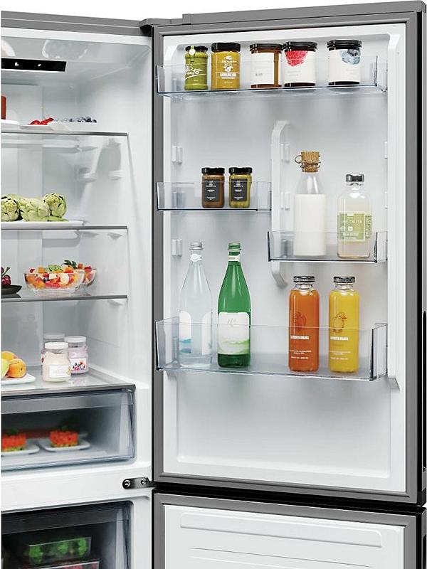 Beznámrazová chladnička Candy se zaměnitelným otevíráním a možností propojení přes chytrý telefon. Zásuvka s nulovou zónou, celkový objem 355 litrů a LED osvětlení.