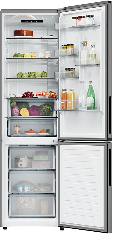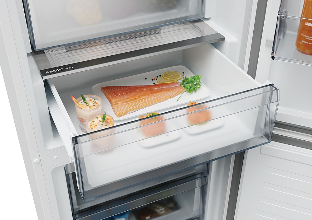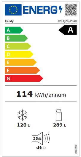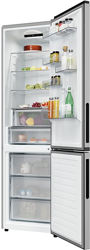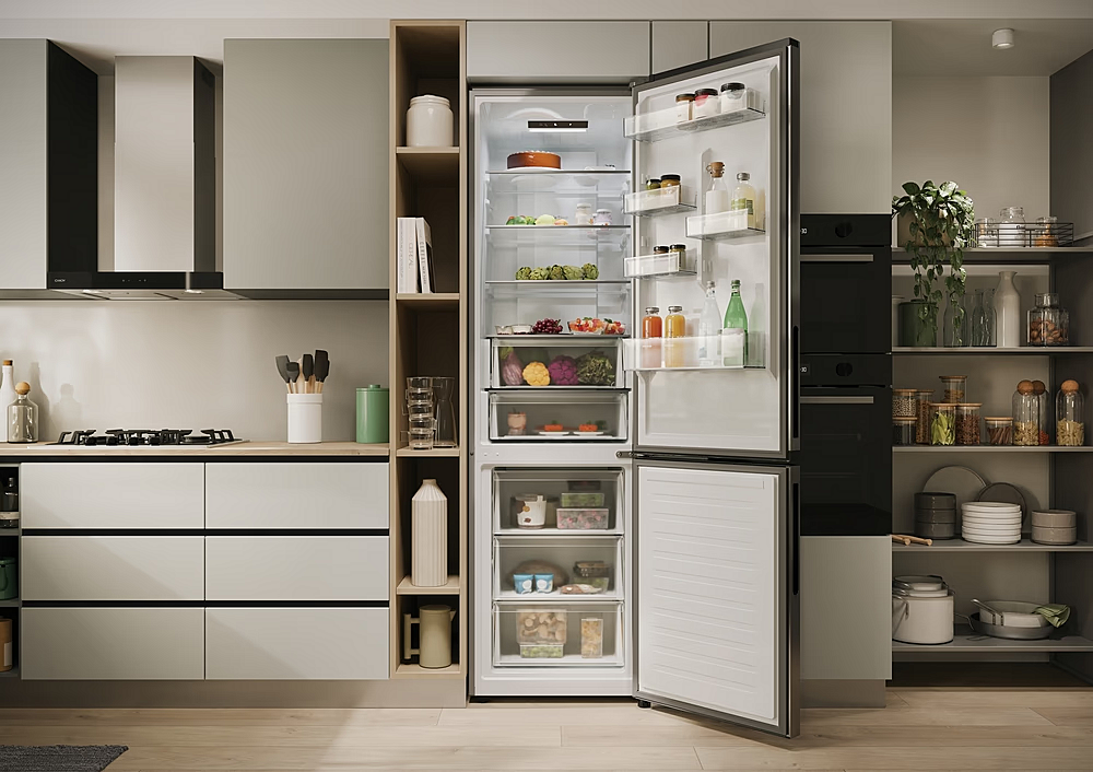 Beznámrazová chladnička Candy se zaměnitelným otevíráním a možností propojení přes chytrý telefon. Zásuvka s nulovou zónou, celkový objem 409 litrů a LED osvětlení.