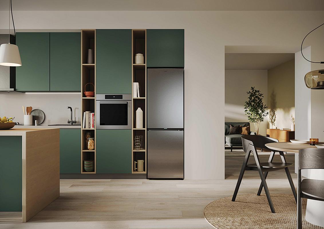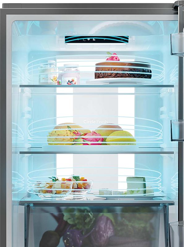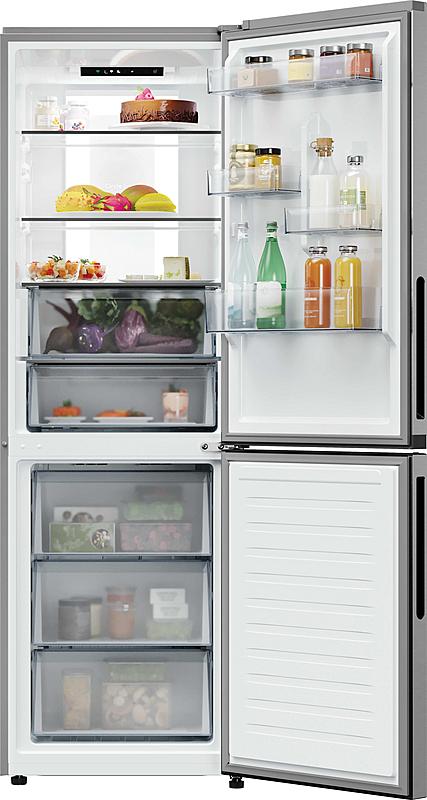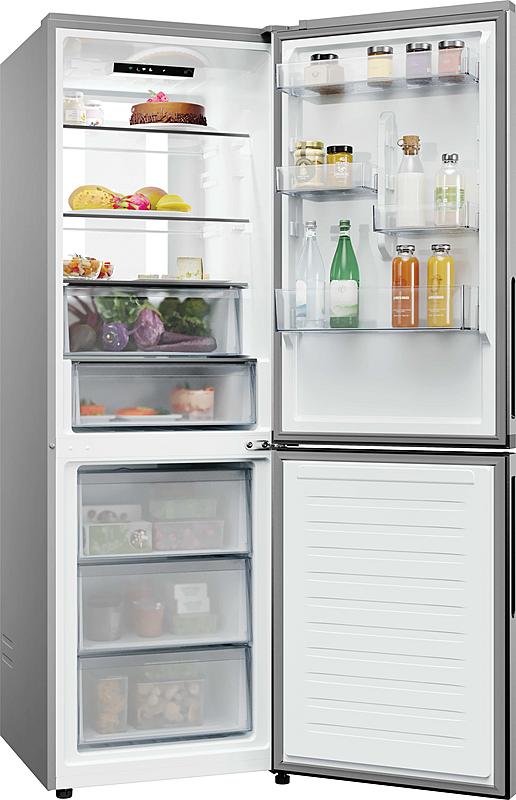 Beznámrazová kombinovaná lednice Candy s nulovou zónou, zásuvkou s řízenou vlhkostí a invertorovým kompresorem. Energetická třída A, celkový objem 355 l a LED osvětlení.